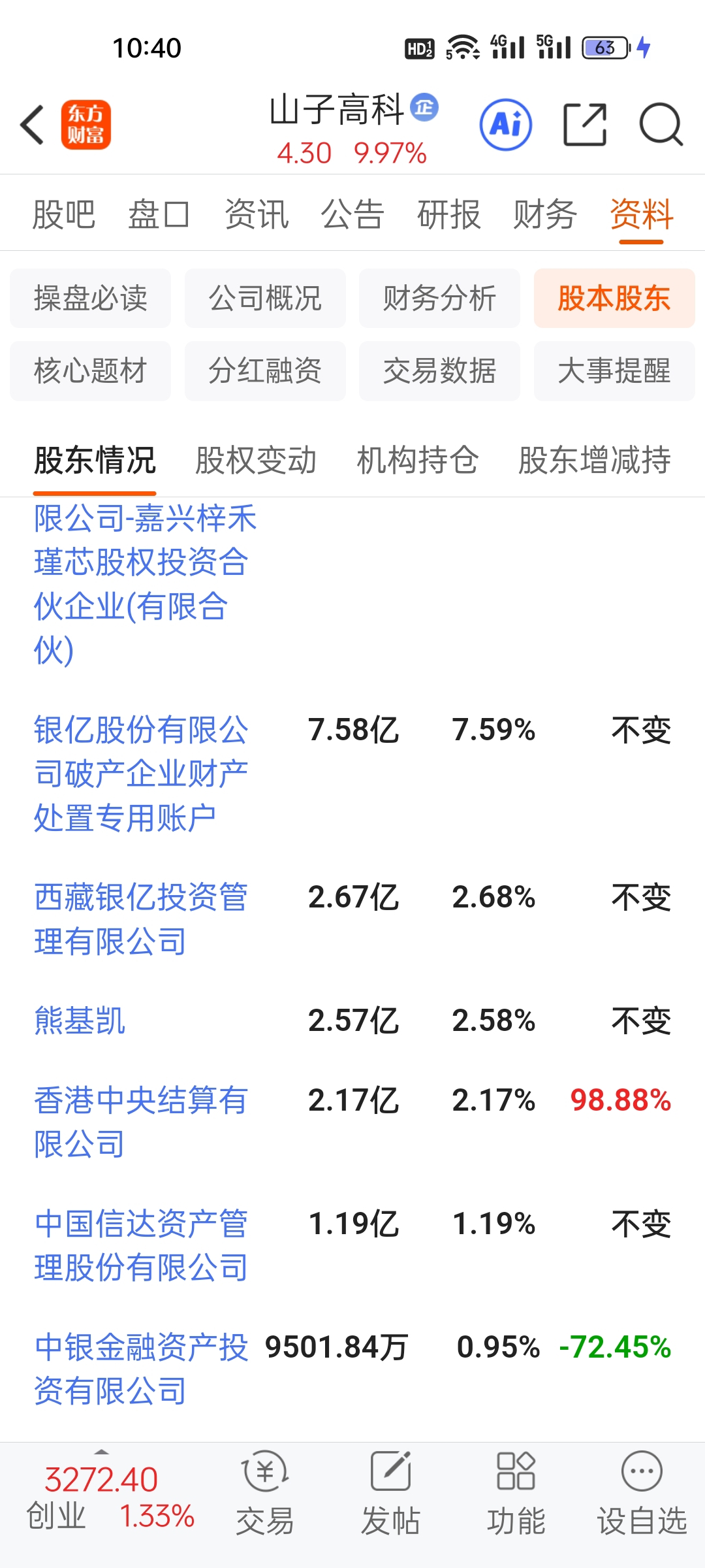 $山子高科(SZ000981)$ 3. 熊基凯:截至2025年6月30日,持股数量为25743.97万股,持股比例为2.58%,为公司前十大股东。目前,阿里巴巴旗下杭州阿里巴巴泽泰信息技术有限公司已与熊基凯达成协议,拟受让其持有的2.81%股份,该交易通过司法执行程序推进,同时阿里资产拍卖平台将于10月29日公开拍卖熊基凯剩余2.58%股份。
