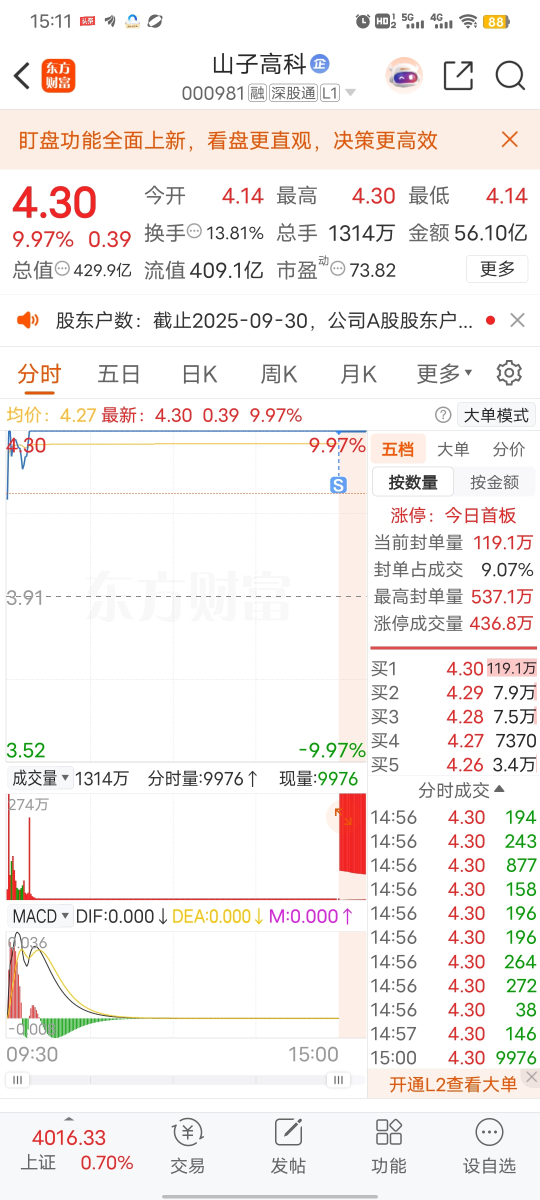 $山子高科(SZ000981)$ 昨天收盘价3.91买的,今天收盘价4.30抛了!