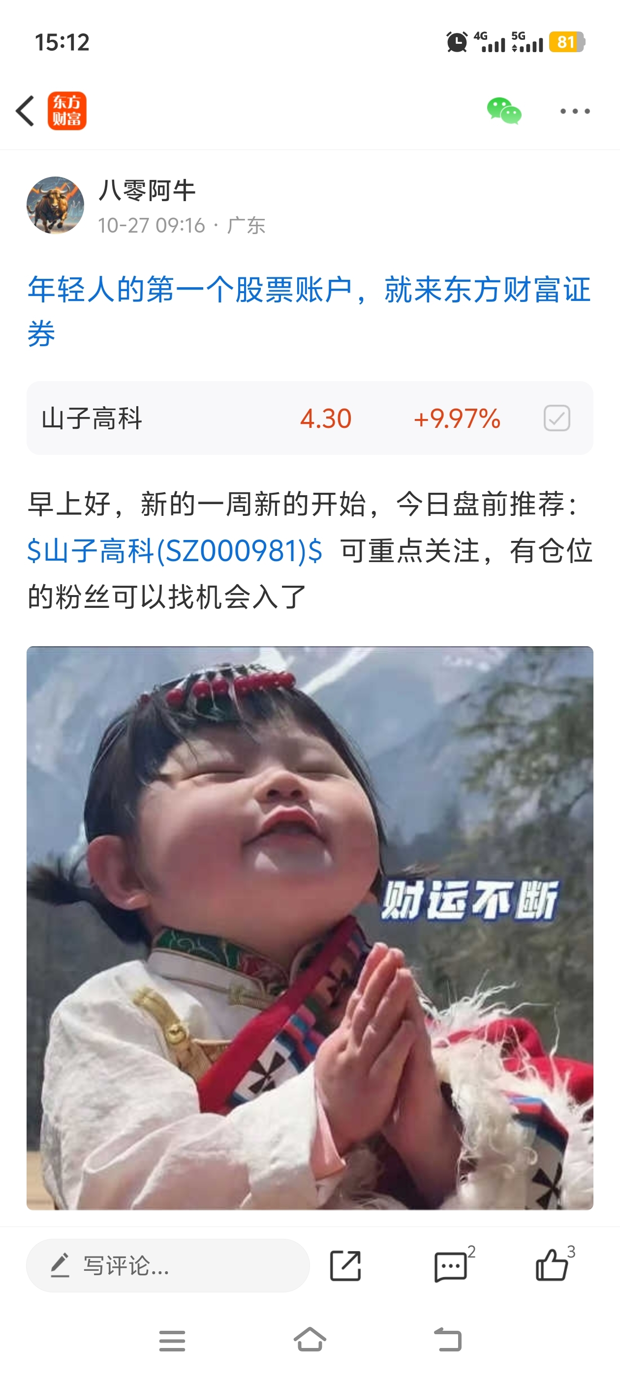 山子漂亮,恭喜同车的粉丝$山子高科(SZ000981)$