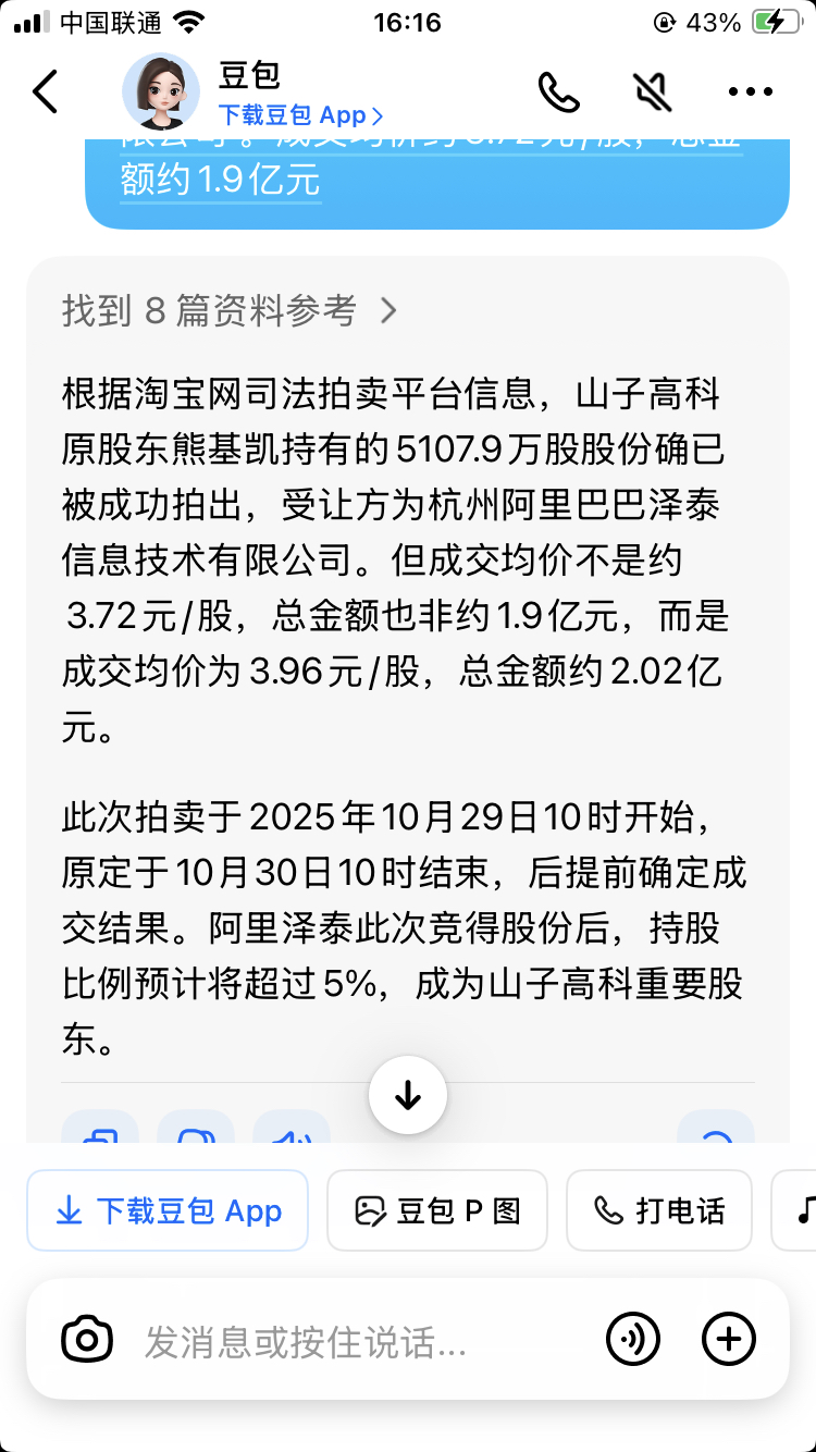 $山子高科(SZ000981)$ 豆包看到 阿里收购了股份 真还是假的?