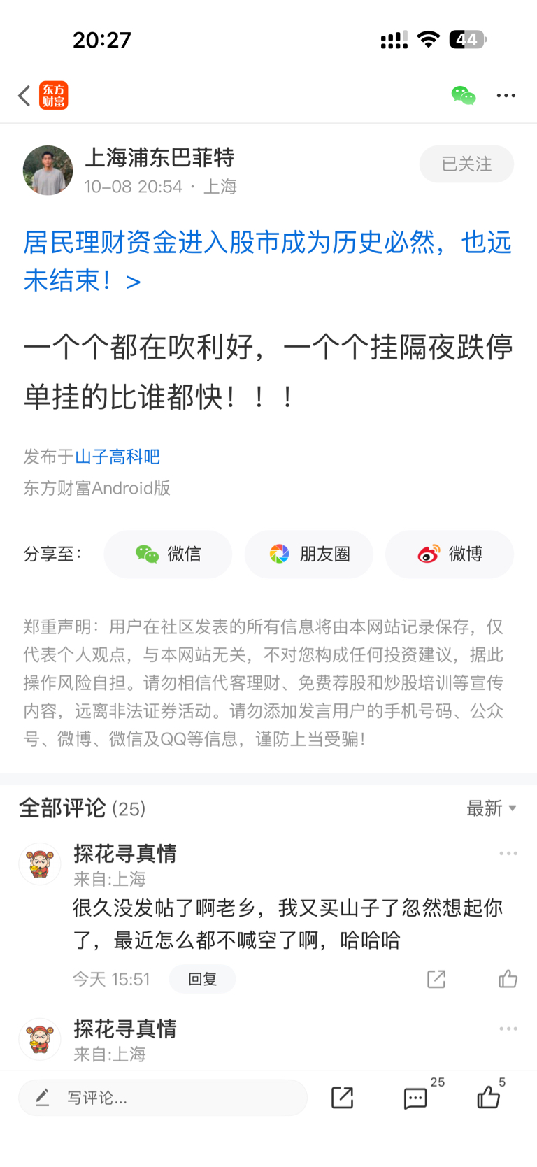 这人是国庆期间的唱空的,三连板后没有再发帖,我今天又买了山子,想起了他还特意去他