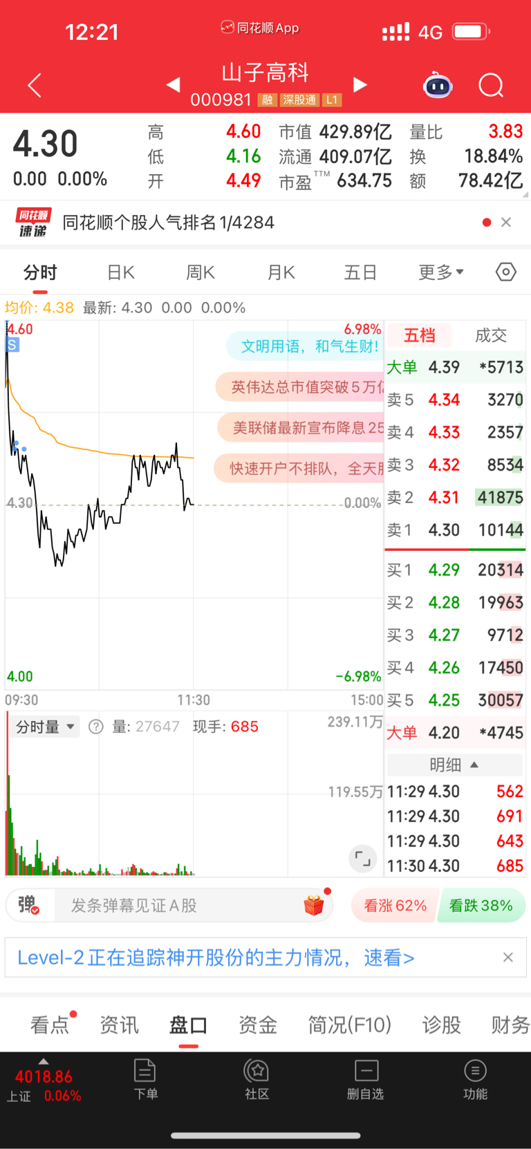 $山子高科(SZ000981)$ 昨天打板进的。今天跑的有点慢均价4个点卖的。下午4块无脑再进。