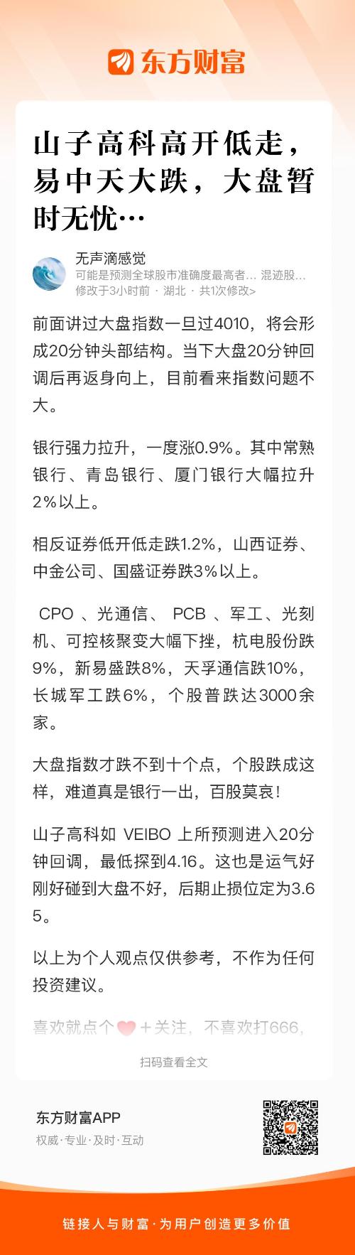 山子高科如 VEIBO 上所预测进入20分钟回调,最低探到4.16。这也是运气好刚好碰到大盘不好,后期止损位定为3.65。