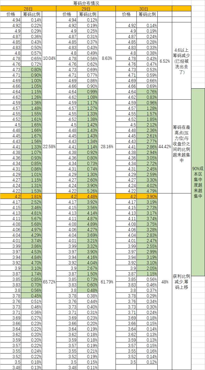 整理了一个筹码分布数据表格,如果单从筹码走势来看的话,今天洗盘无疑了,我继续格局