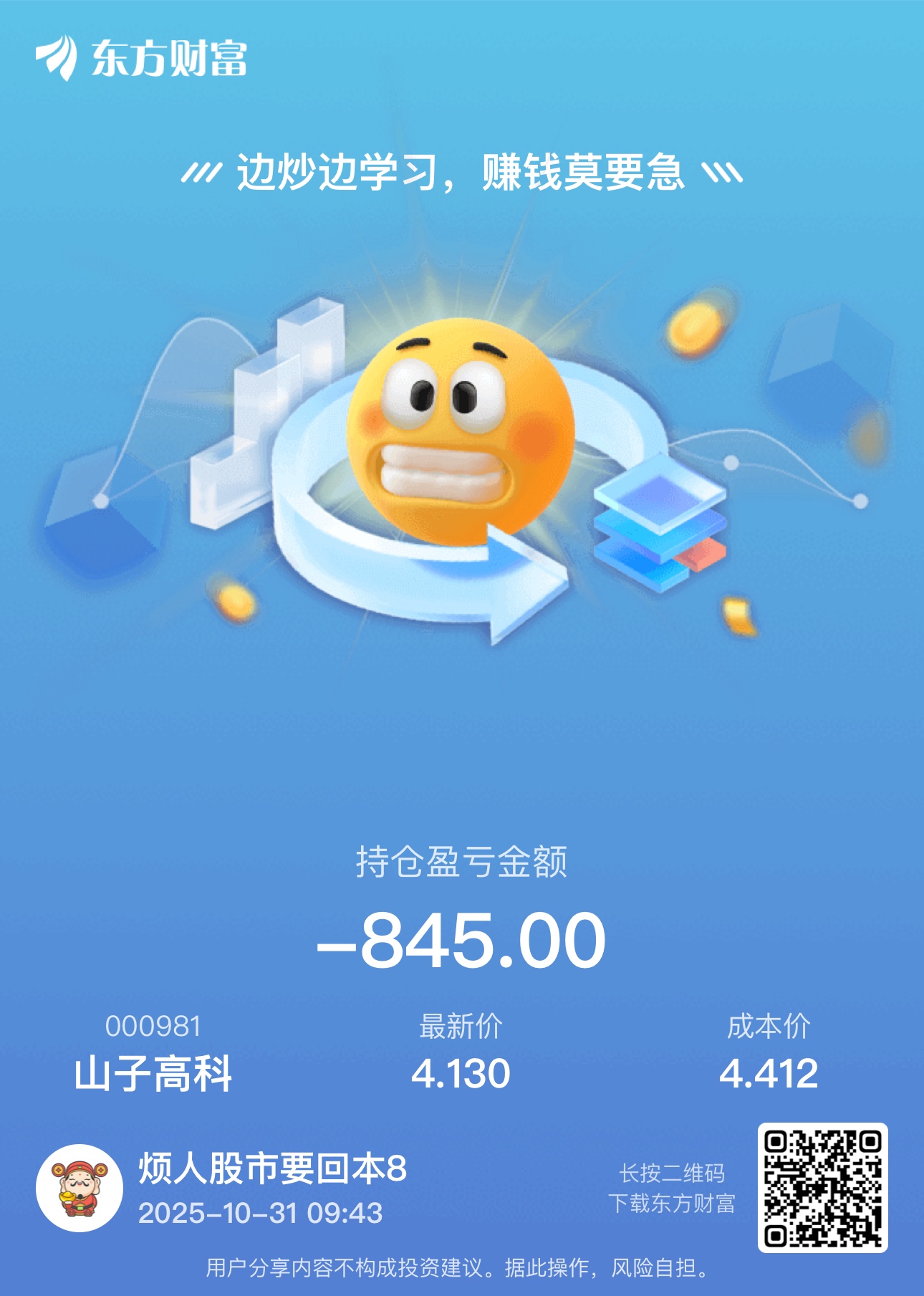 温馨提示: 1.根据《证券法》规定,禁止编造、传播虚假信息或者误导性信息,扰乱证券市场;2.用户在本社区发表的所有资料、言论等仅代表个人观点,与本网站立场无关,不对您构成任何投资建议。用户应基于自己的独立判断,自行决定证券投资并承担相应风险。《东方财富社区管理规定》