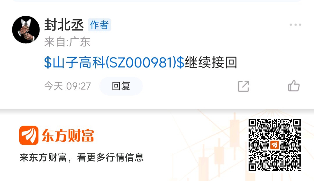 今作$山子高科(SZ000981)$ 水下继续接回,山子高科昨天回踩20日线,跳空缺口很大,如果今天开盘跌破均线支撑的话,大概率会去回䃼完缺口。如果保持强势继续站稳短期均线群的话,那么就还算比较好的情况。
