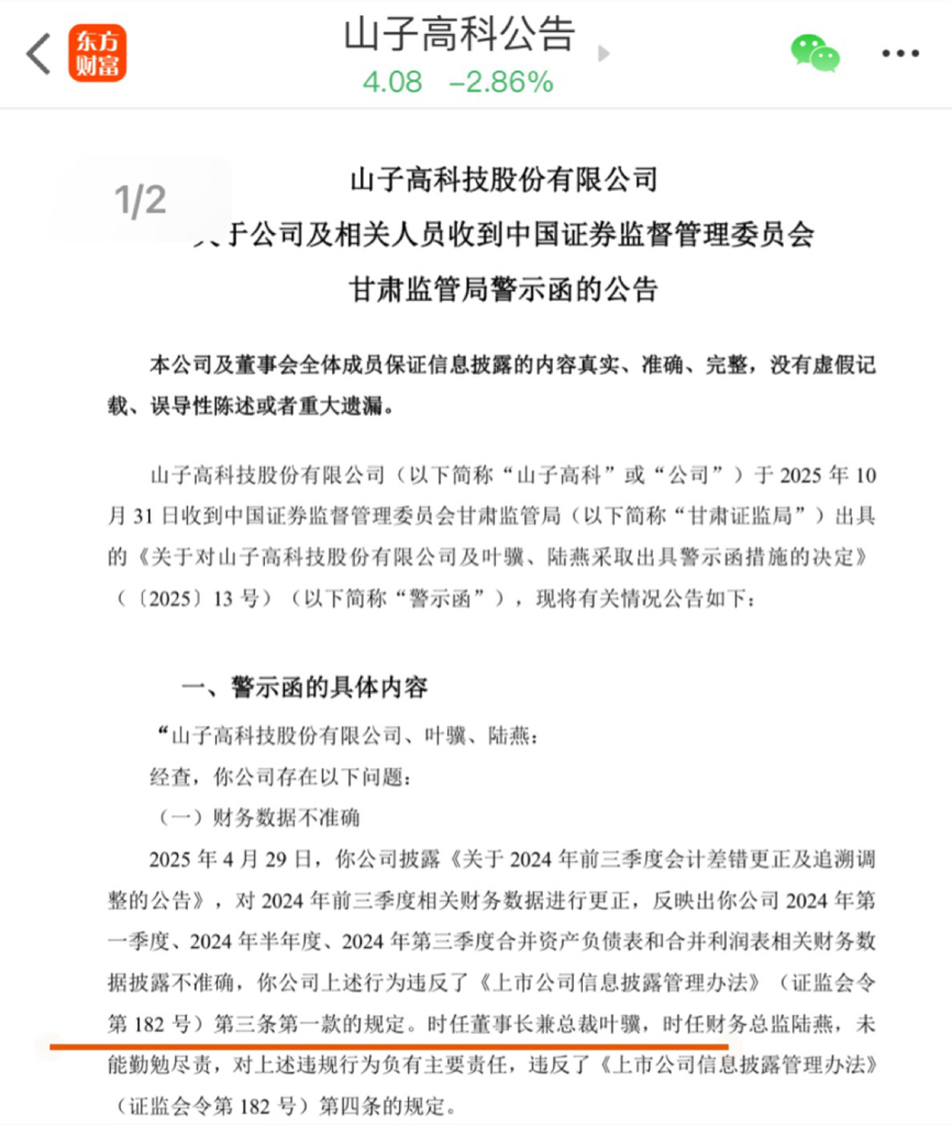 山子高科业绩披露违规,违反了:证监会令第182号第三条第一款的规定,接下来就是移