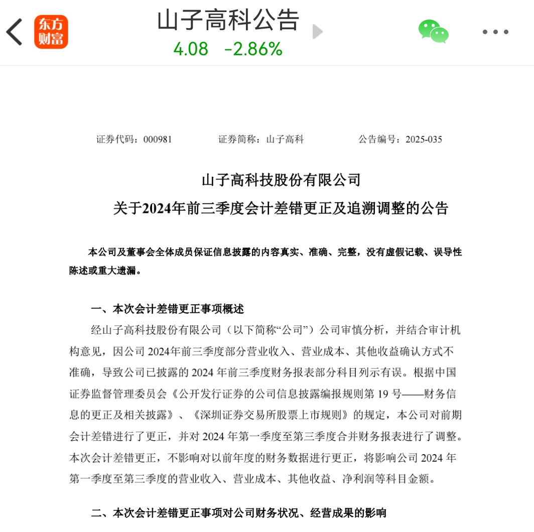 2025年4月山子发布会计差错更正公告(公告编号:2025-035),2025年