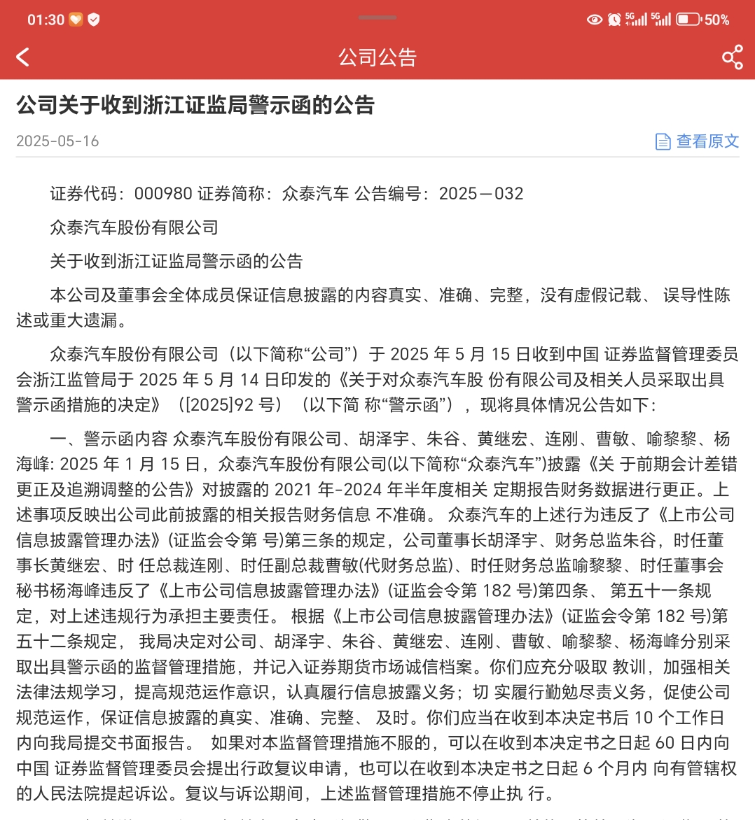 不知道你们慌什么。看看众泰汽车当时发完警示函是怎么样。对标一下是涨是跌