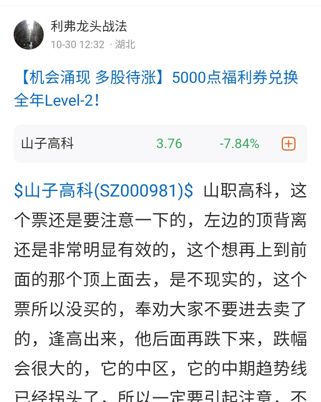 山子高科。我在30号就说了,这个票只能卖,不能买。当时有很多人喷我