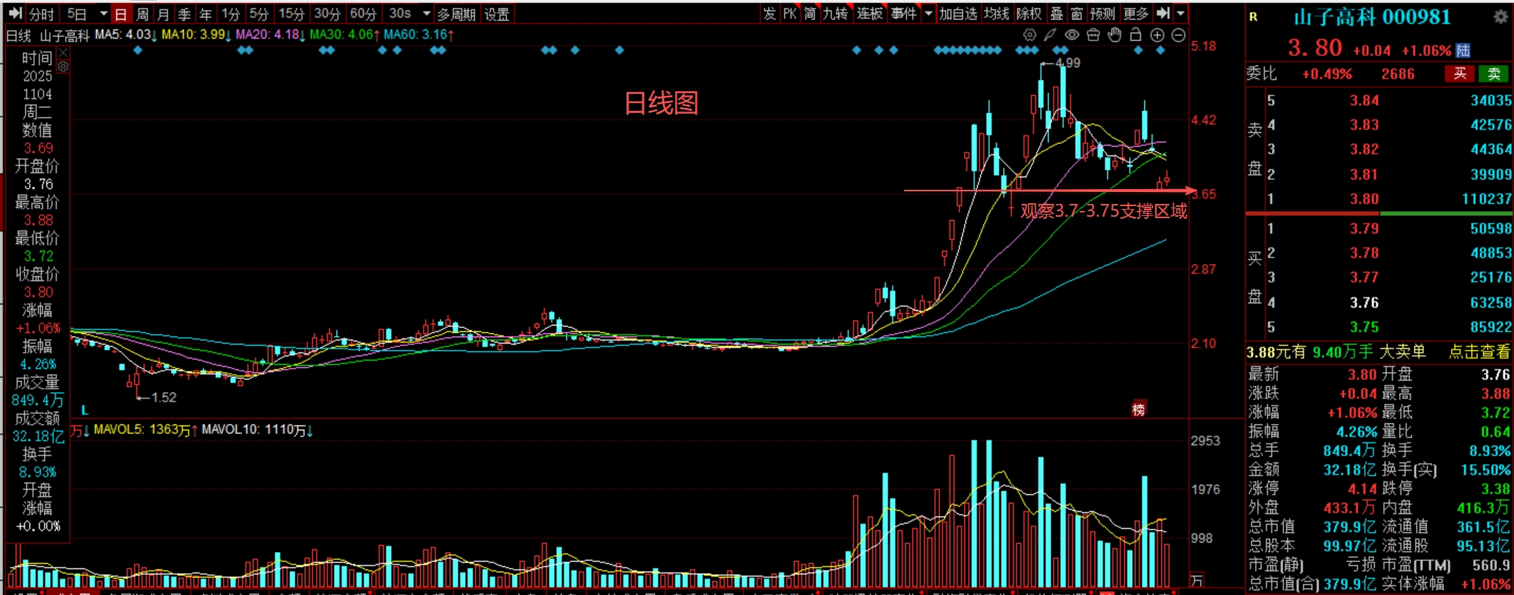 当前走势处于弱势整理,股价在短期均线下方运行,量能萎缩显示市场参与度不高。目前关键看能否重新站稳5日均线,若能放量突破4.03元并站稳,则有望扭转弱势;若继续在5日线下方震荡,则可能向下考3.70-3.75元支撑区域。当前位置不建议新建仓位,已持仓者建议以5日线作为短期减仓参考。