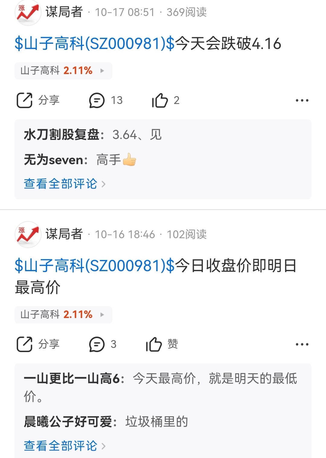 $山子高科(SZ000981)$ 2024年12月3号入山子 直到2025年10月15号获利逃顶 16号开始我提示各位这票完了 后面陆续提醒过多次 你们自己看 拿实力说话 别张嘴踏空闭嘴空狗 这票想买每天都可以买 每一分每一秒都可以买 有什么可踏空的 主力怕的是你们踏空