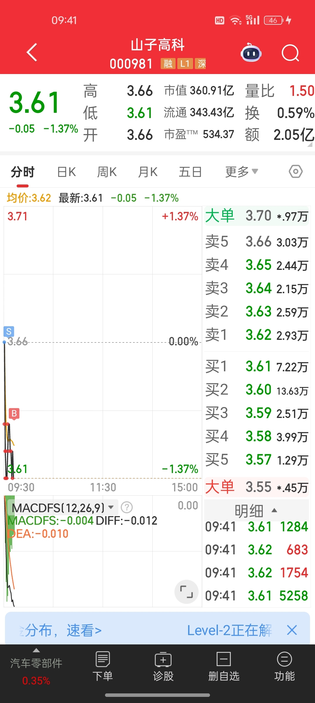 $山子高科(SZ000981)$ 鄙人不才,全仓买入,杠杆拉满。集合竞价出掉的仓位已全部全仓追回。后面涨跌与我无关,今日基操已完成,下班,看迎新发展重复我山子高科10月14日走势