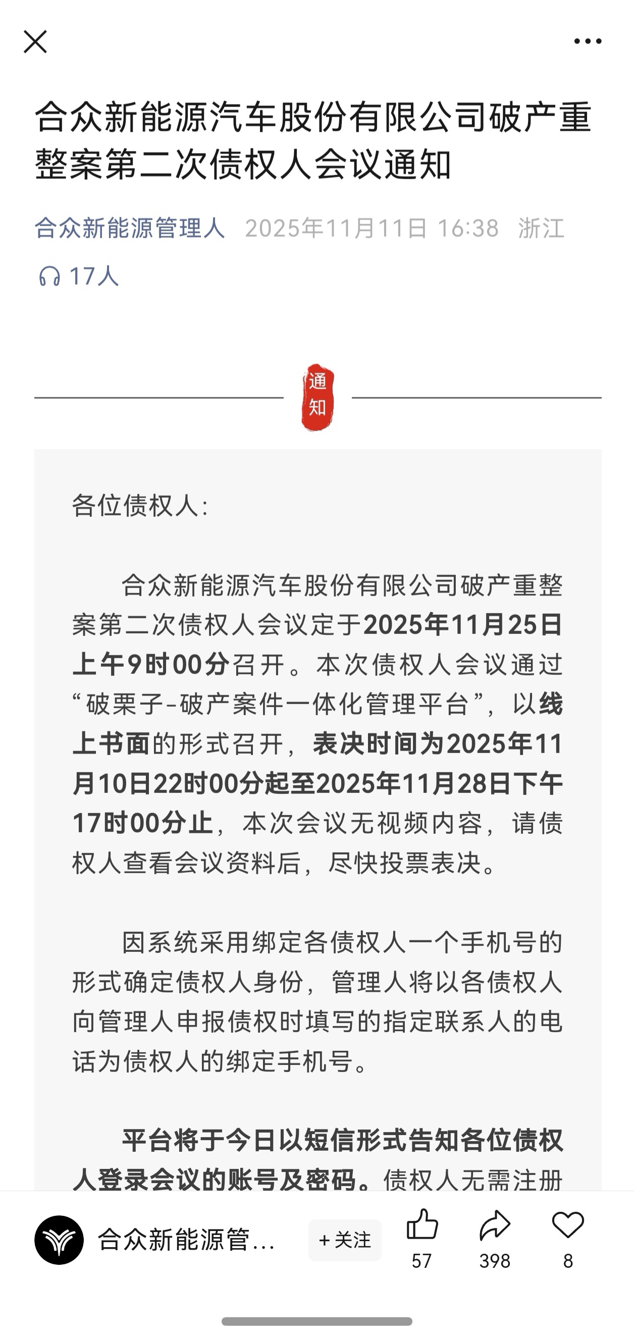 山子13号召开临时股东大会,合众新能源今天发公告准备召开破产重整第二次会议,所以