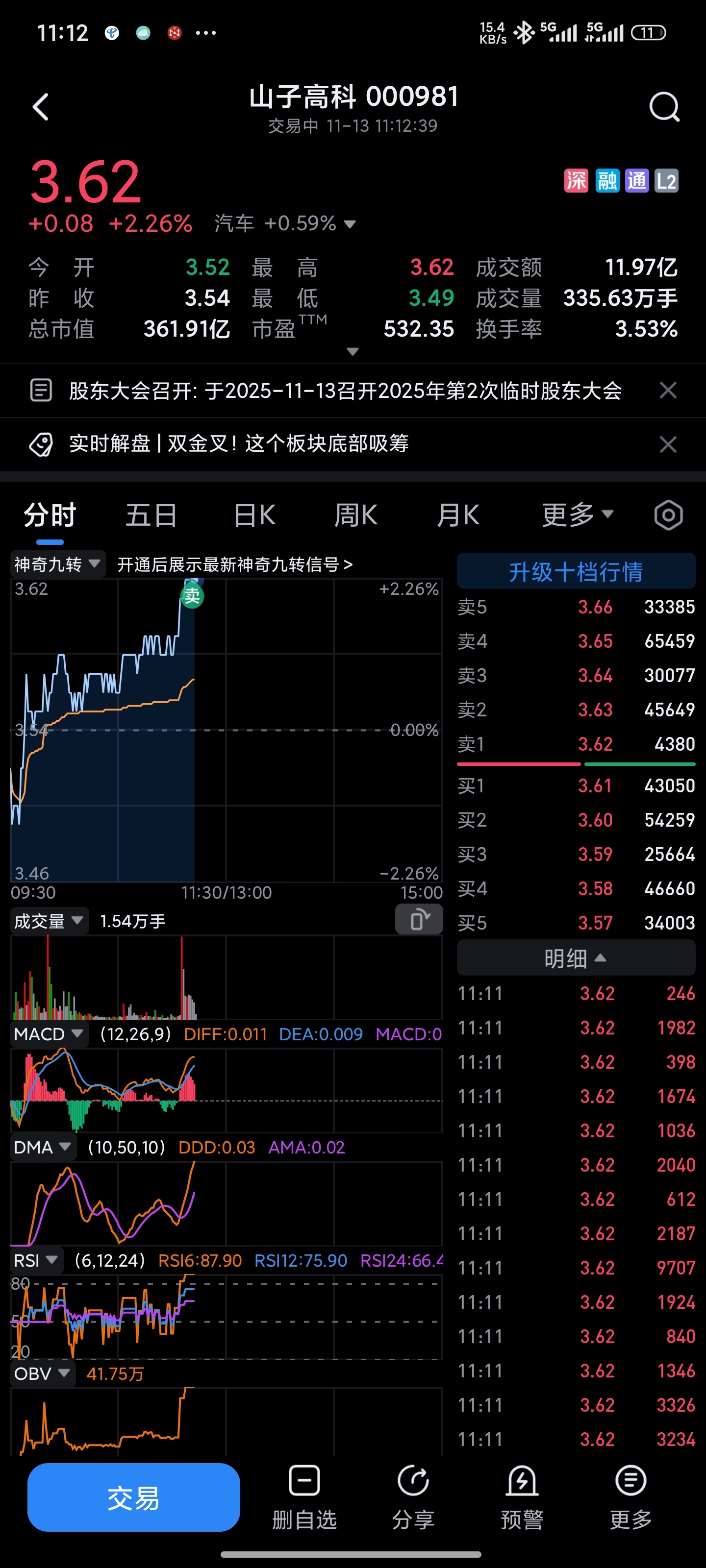 $山子高科(SZ000981)$ 明天不太乐观我已经全部清仓了,今天股东会议有点麻烦,而且资金入驻力量不大有点像故意拉高套人,先解套为主,这票有高风险今天,就怕明天大拉跌下来