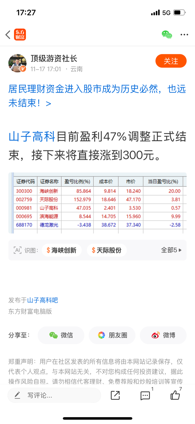 $山子高科(SZ000981)$ G脱推荐看到300元,明天大跌5个点以上。