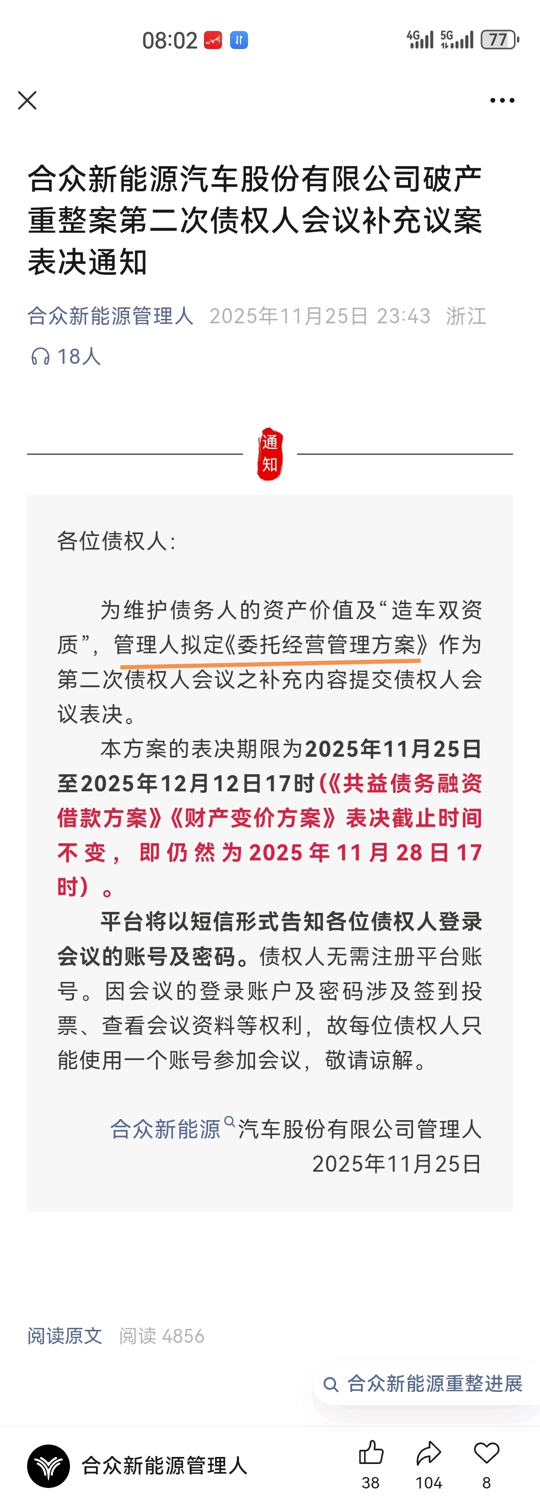 意味着重组经营方案在合众新能源内部已经过会,等待债权人投票表决。