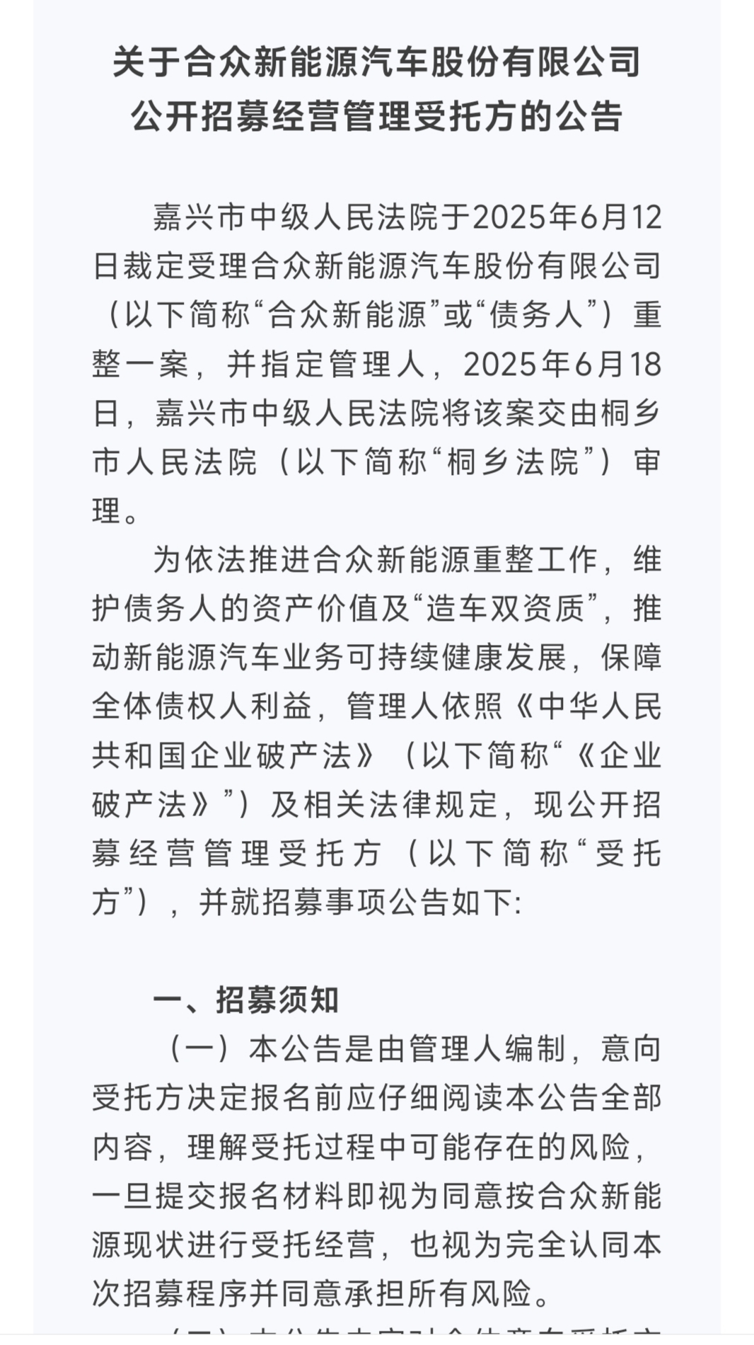 关于合众新能源汽车股份有限公司公开招募经营管理受托方的公告