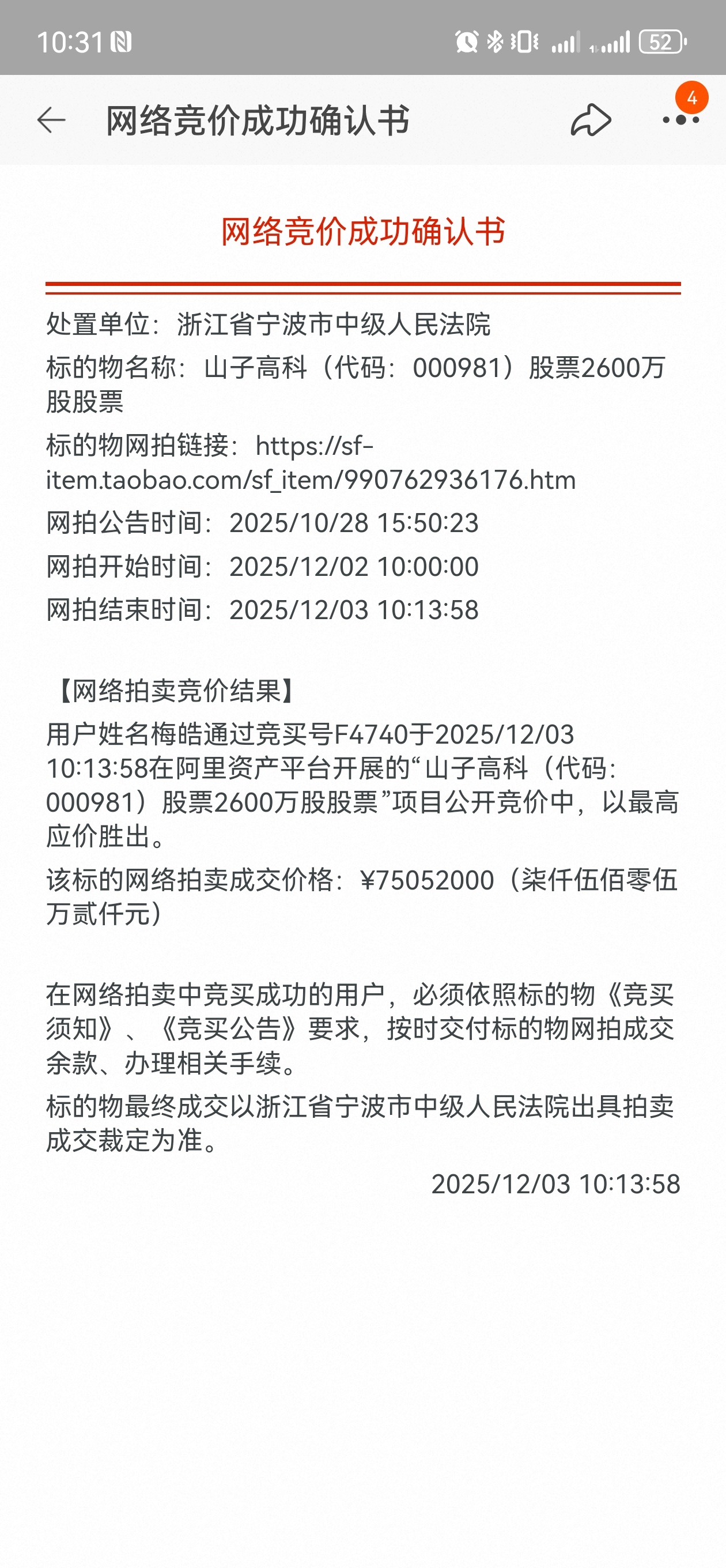 $山子高科(SZ000981)$ 阿里拍卖,恭喜梅老板拿下