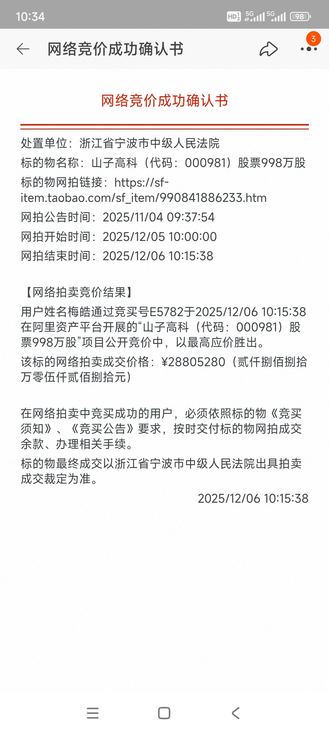 $山子高科(SZ000981)$ 又是梅皓老板拍下了。牛笔了兄弟们。已经连续拍下2个拍卖了,这次更是连续加价强势拿下。有一种神挡杀神,佛挡杀佛的气质。哎,可惜我买少了了。主力,下周一一定要低开啊,我要加仓,给个机会吧。