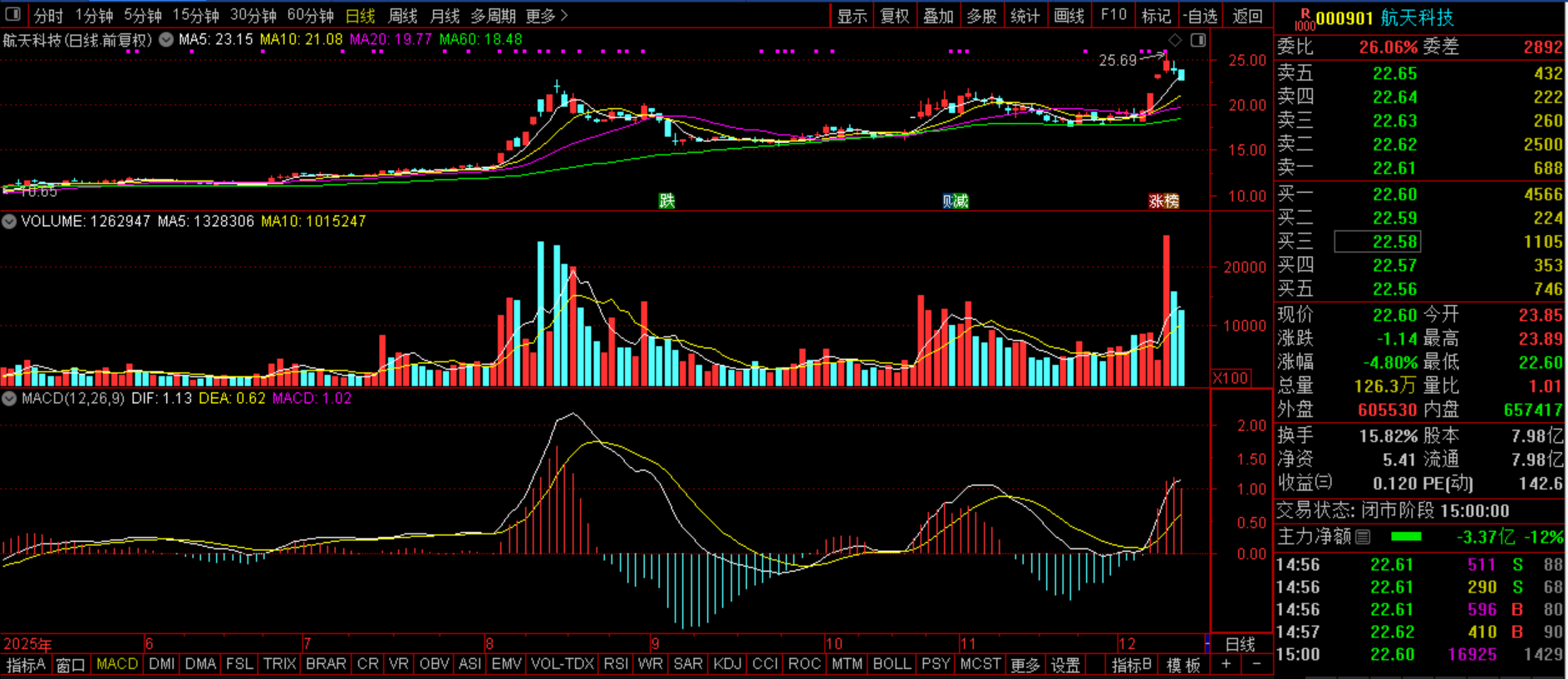 $航天科技(SZ000901)$(SZ000901):商业航天+卫星导航+央企+航天应用+车联网+中报预增。今日此股走势远远弱于预期,其根本在于大盘走势欠佳,而商业航天个股分化。该股开盘就逐步走低,最终虽跌破5日线,不过盘中猪力曾多次护盘拉涨,量能萎缩,股价依旧位于突破态势中,因此今日的走势是良性分歧,下日修复。对于后市笔者依旧看涨,短期的话,可能仍将震荡整理。