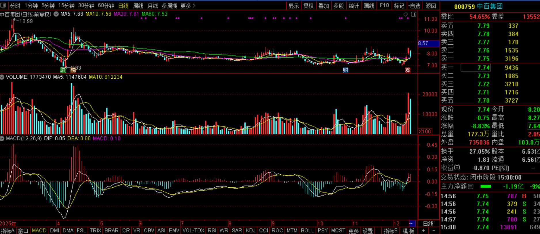 $中百集团(SZ000759)$:湖北国资+商超龙头+减亏转型++零售+国企改革+免税店。今日该股大幅低开然后地板,不过午后曾炸板大幅拉涨,可惜的是大盘不太给力,最终该股依旧大跌将近9个点,量能略有萎缩,不过盘中猪力强势护盘坚挺,并且最终依旧守住了5日线,因此笔者认为这种走势就是猪力借用突发利空的超级打压,是良性调整,明日修复,当然可以继续关住研究。
