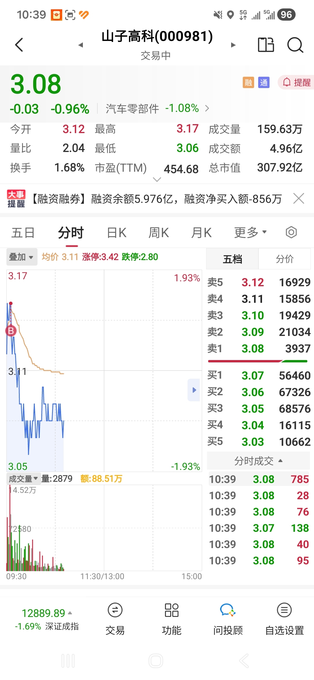 $山子高科(SZ000981)$ 昨天晚上挂3.09,结果竟价3.09,撤销挂3.07,结果开盘3.12,挂3.15买住了,结果赔了几百块。