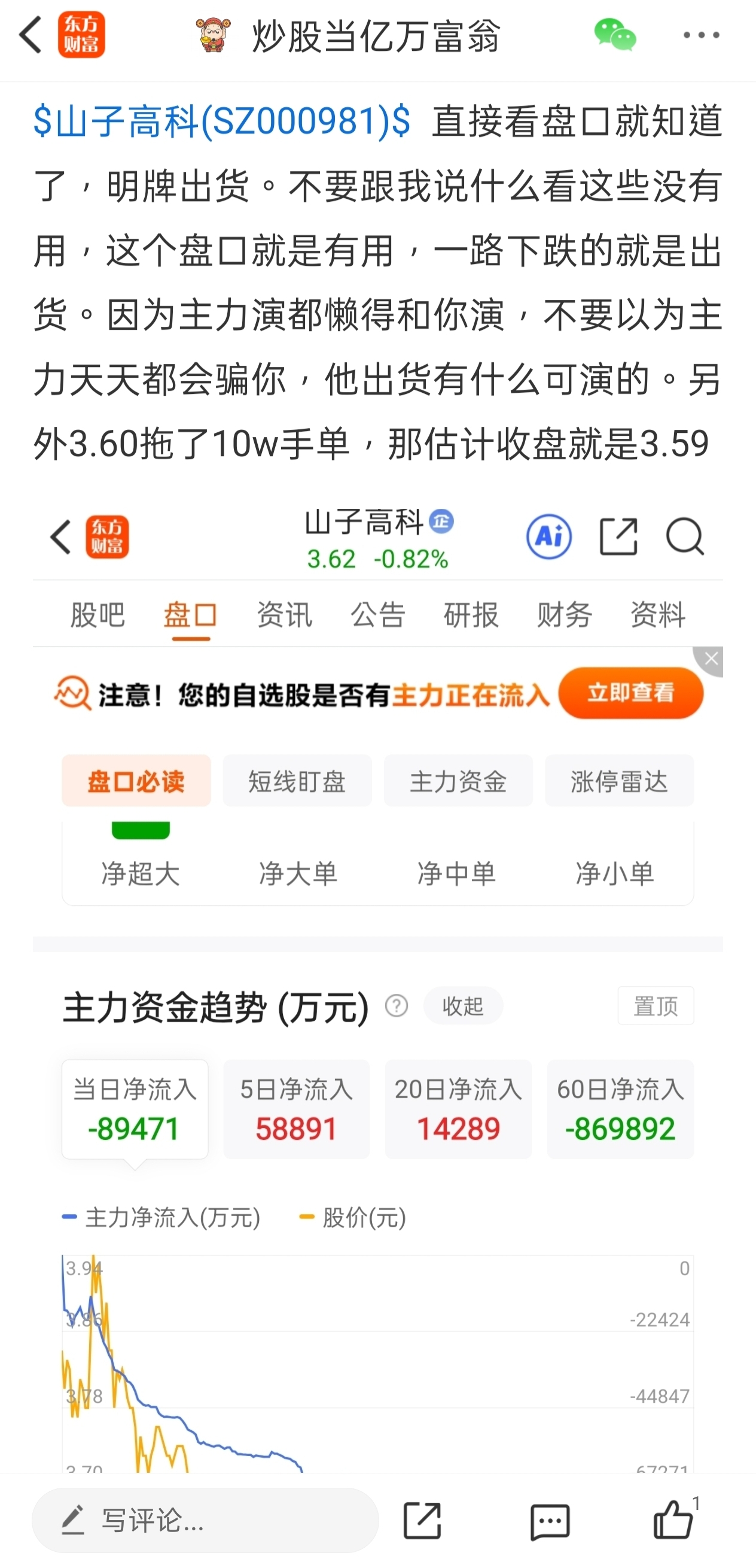 $山子高科(SZ000981)$ 就问你们说的准不准,是不是3.59收。看盘口觉得一切,盘口流入不一定好,盘口一路下跌那一定是坏。