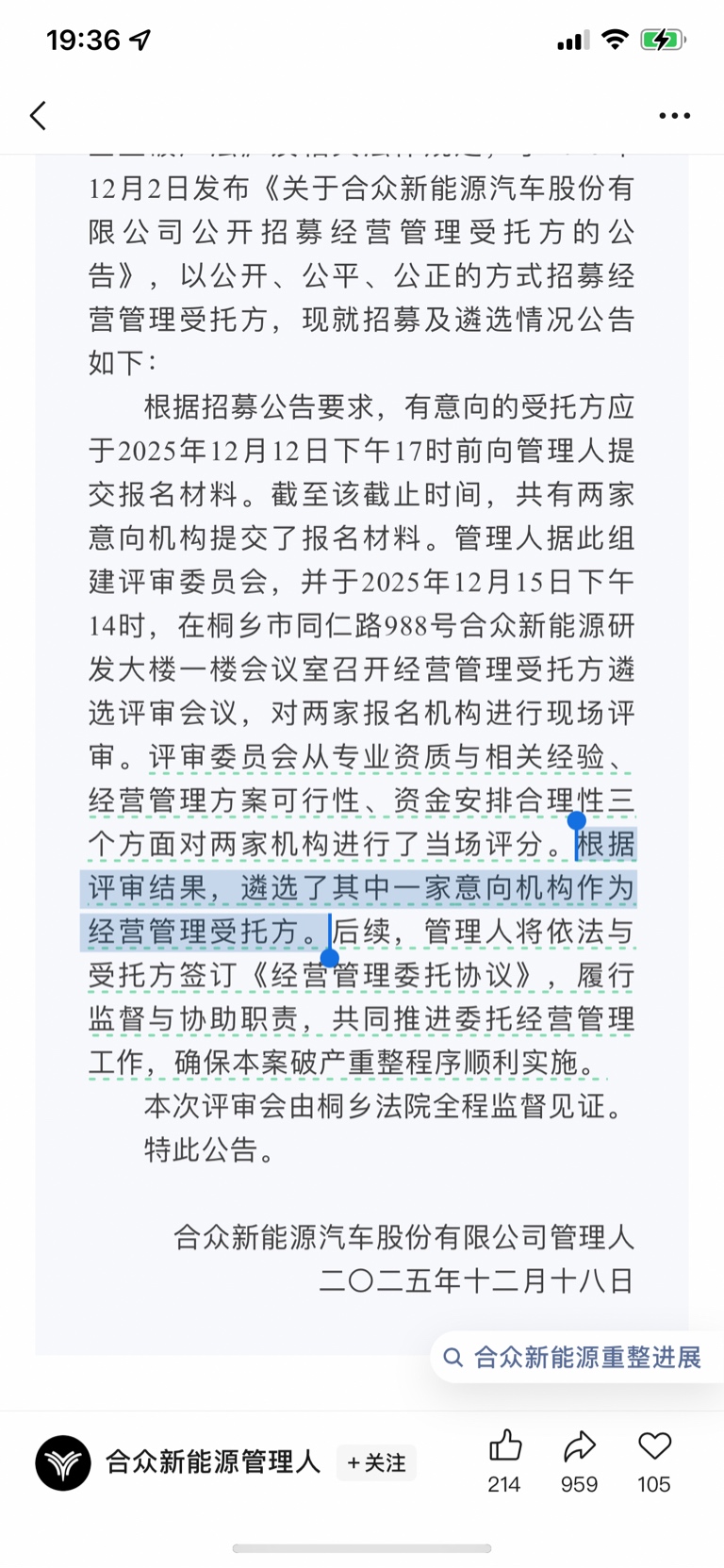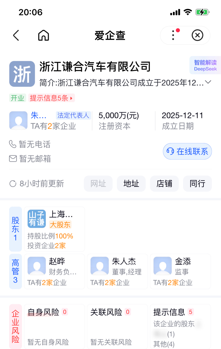 $山子高科(SZ000981)$ 2025年12月11日成立浙江谦合汽车有限公司,法人朱人杰。合众汽车声明:新任CEO由具备跨国车企管理经验的资深人士担任,朱人杰应该没有悬念