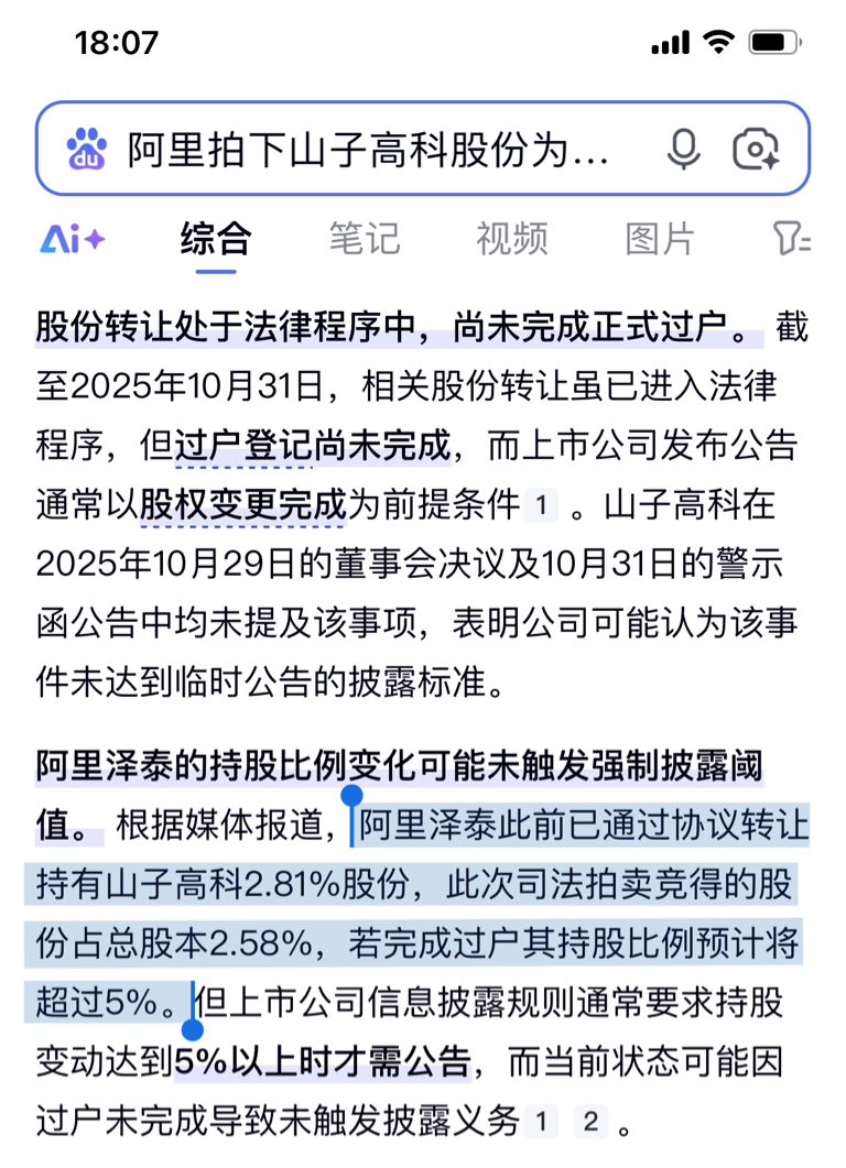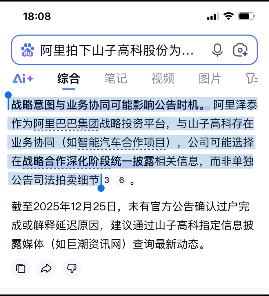 $山子高科(SZ000981)$ 战略意图与业务协同可能影响公告时机。阿里泽泰作为阿里巴巴集团战略投资平台,与山子高科存在业务协同(如智能汽车合作项目),公司可能选择在战略合作深化阶段统一披露相关信息,而非单独公告司法拍卖细节。