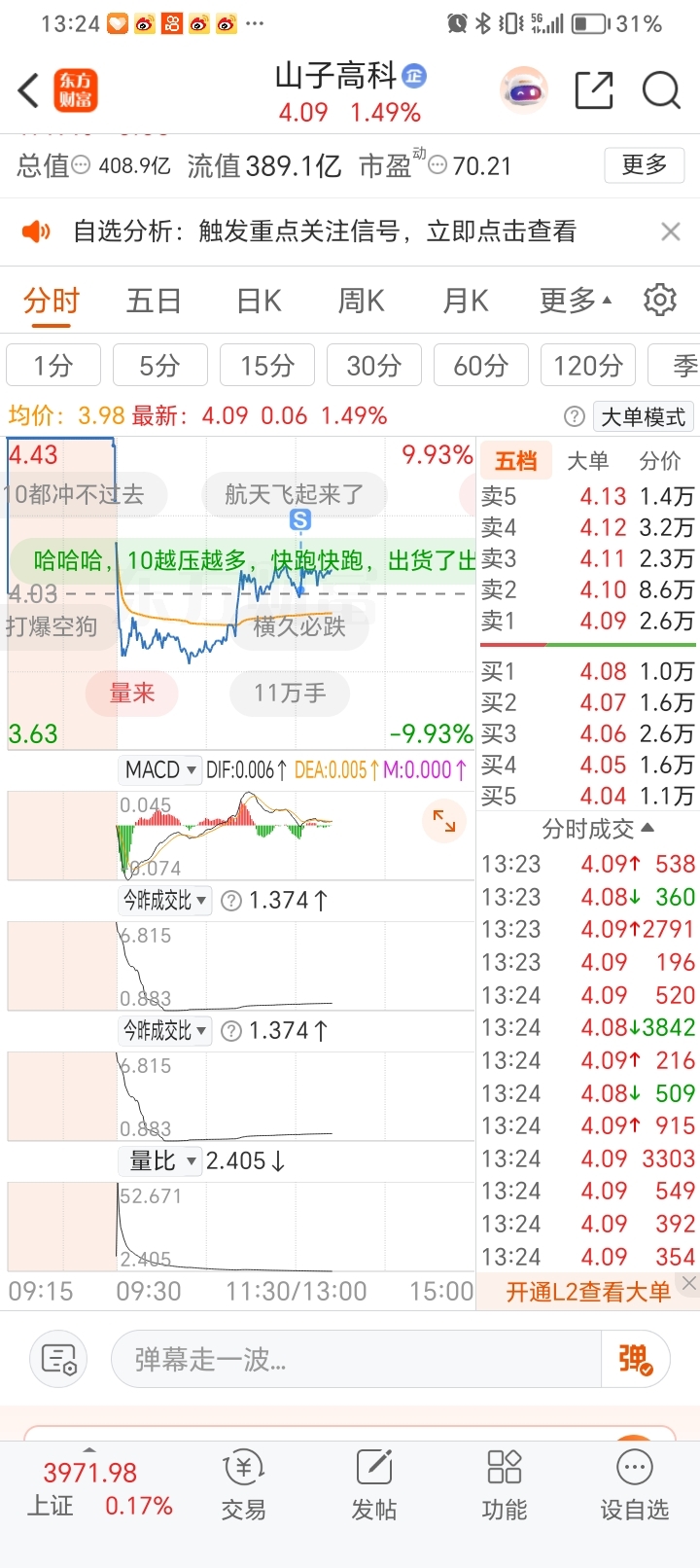 $山子高科(SZ000981)$ 哎,早知道早上就跑了,