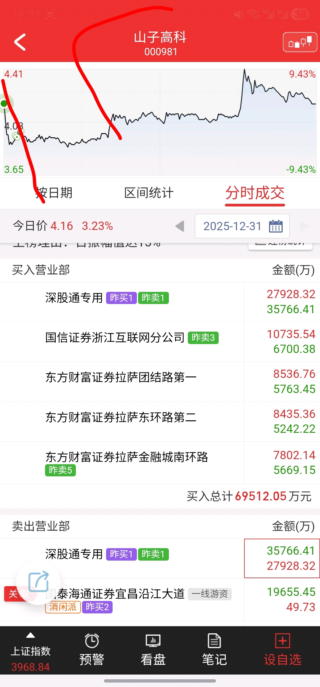 $山子高科(SZ000981)$ 看今晚龙虎榜,好像是深股通开盘砸盘,触发量化跟着砸盘,柚子也跟着出货。按这种出货量的砸到深水,或者跌停去。竟然浅水区能抗住这么大抛压,下午两点的拉升,毫不费力。不是涨停板90万手吃不掉,好像是控盘资金有意而为之。普通小老百姓,拿好筹码看大资金博弈就好。山子爆发期马上到了