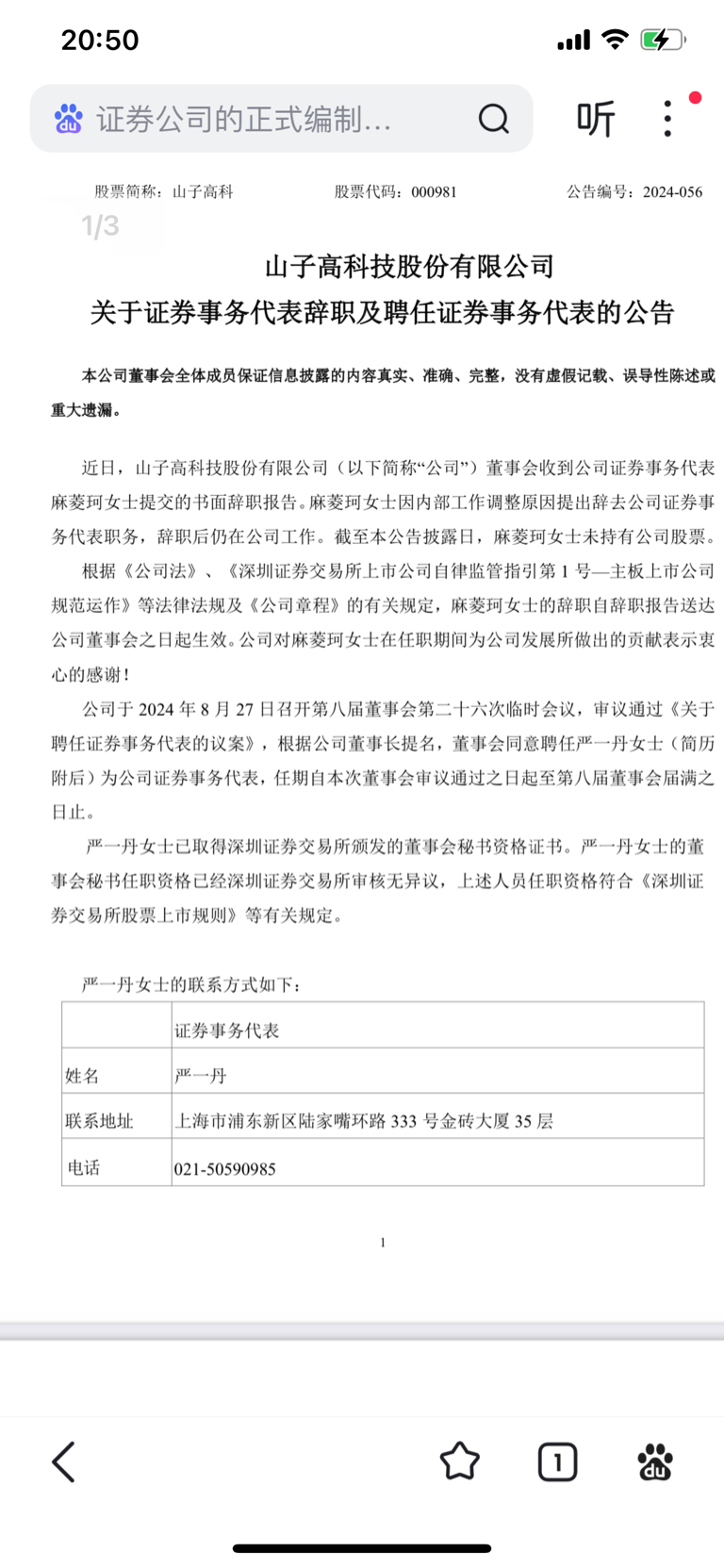 2024年8月27日-2025年1月6日任山子高科证券代表;