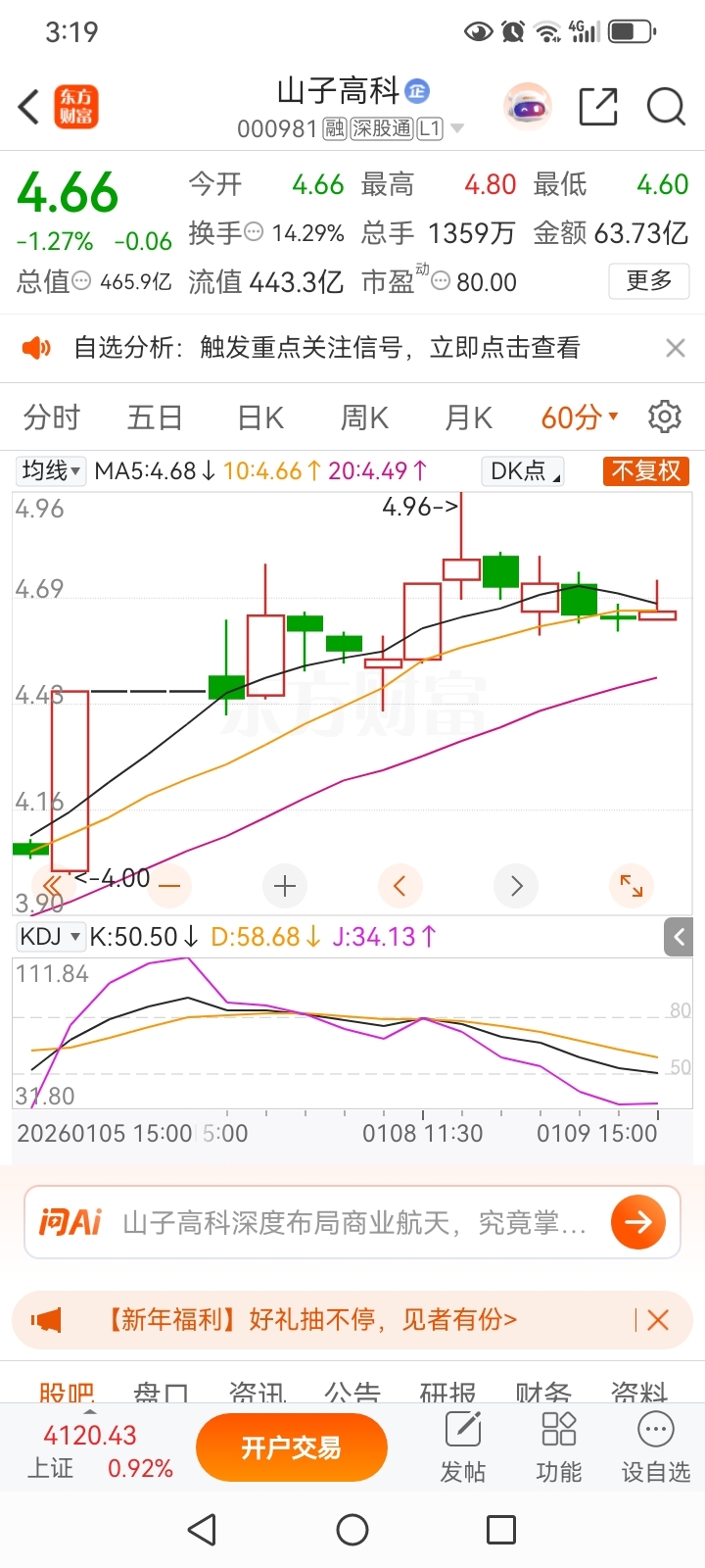 $山子高科(SZ000981)$ 下周一看谁跑的快吧,60分钟己经拐头向下了。