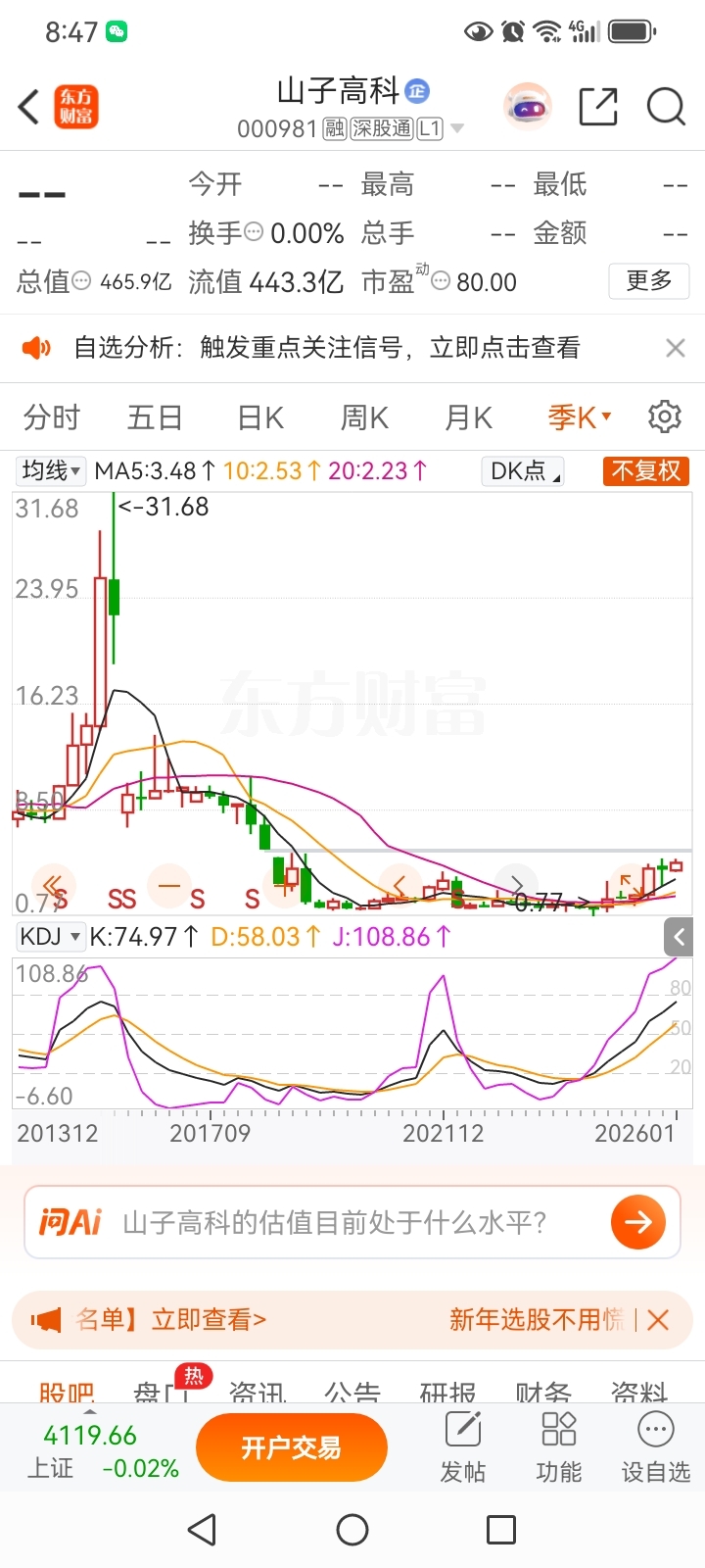 $山子高科(SZ000981)$ KDJ都到头了,不可能再往上涨了。