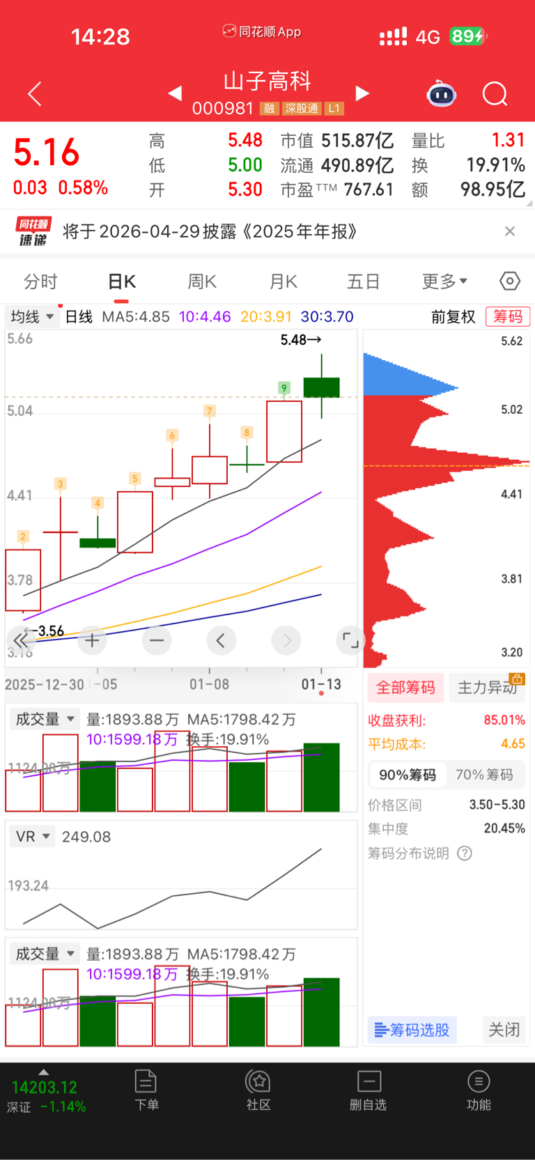 $山子高科(SZ000981)$ 筹码密集峰没有松动,4.6的筹码基本上没有选择兑现,可能只是主力在这个位置继续顺大盘下跌做T了。