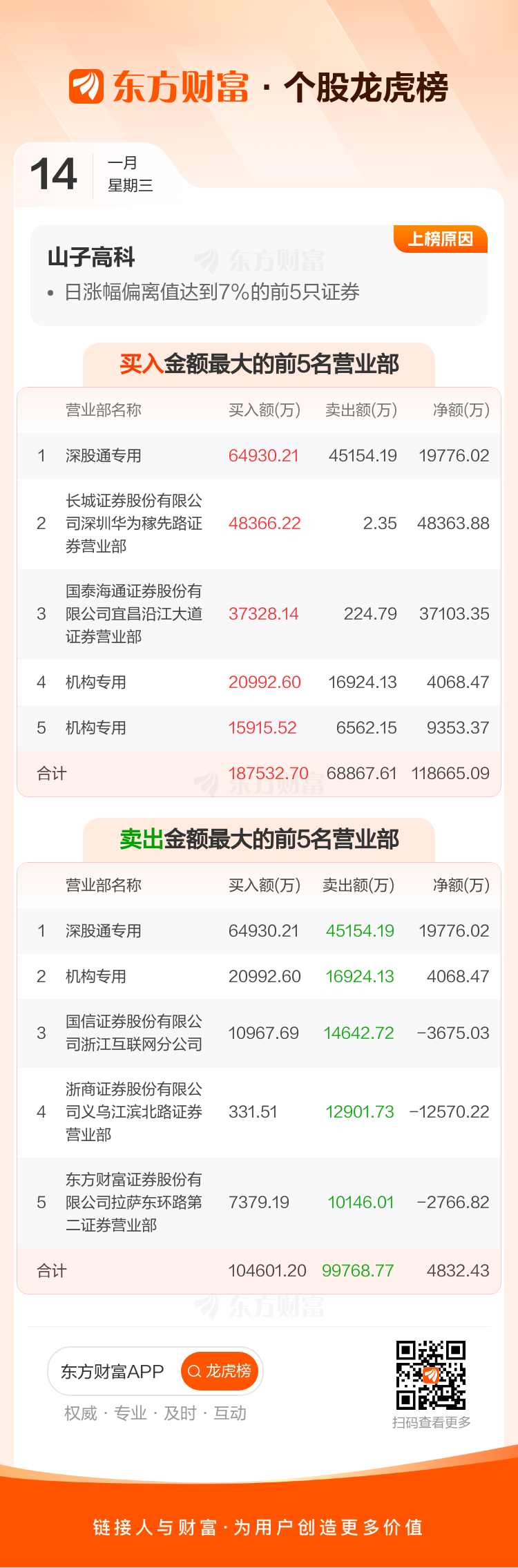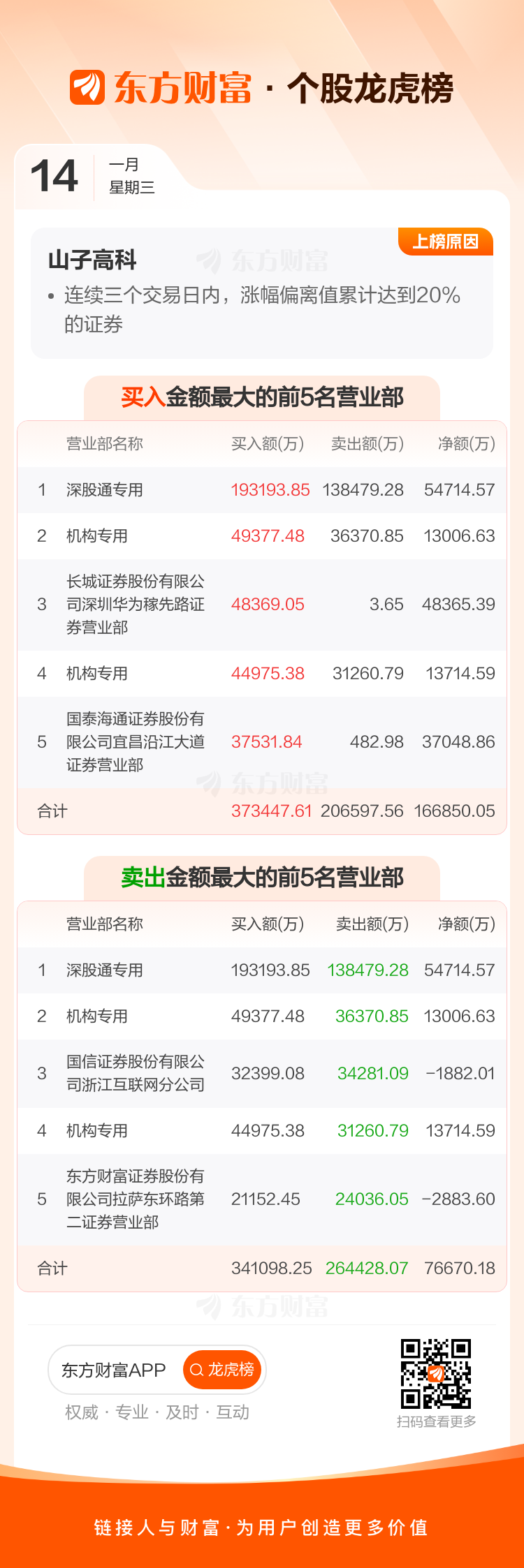 交易所2026年1月14日公布的交易公开信息显示,山子高科因成为日涨幅偏离值达到7%的前5只证券、连续三个交易日内,涨幅偏离值累计达到20%的证券上榜。山子高科当日收报5.67元,涨跌幅10.10%,偏离值9.35%,换手率24.14%,成交额128.48亿。异常期间1月12日至1月14日,期间涨幅21.67%,累计偏离值20.42%,区间成交额324.34亿。