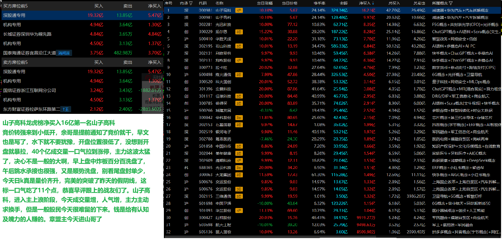 山子龙虎榜净买入16亿第一名