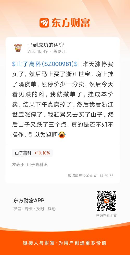 $山子高科(SZ000981)$ 昨天涨停我卖了,然后马上买了浙江世宝,晚上挂了隔夜单,涨停价少一分卖,然后今天看见跌的凶,我就撤单了,挂成本价卖,结果下午真卖掉了,然后我看浙江世宝涨停了,我赶紧又去买了山子,然后山子又跌了三个点,真的是还不如不操作,引以为鉴啊