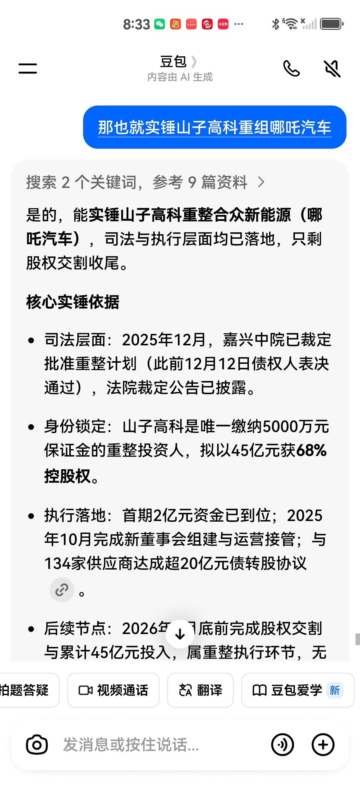已经实锤山子高科重整哪吒汽车