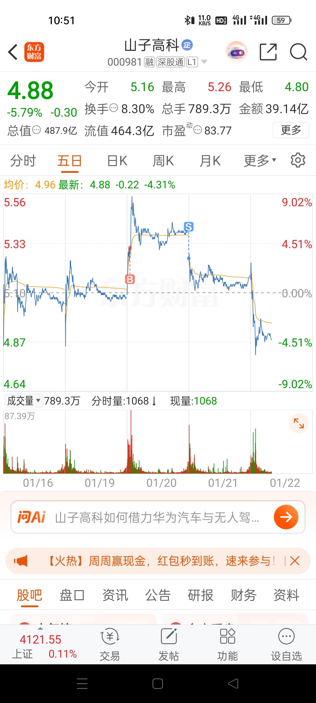 $山子高科(SZ000981)$ 前天晚上有人吹好多看好!我就说明天低开下杀跌停!虽然昨天没有跌停,但今天补跌,两天十点,昨天幵盘买,小亏亏