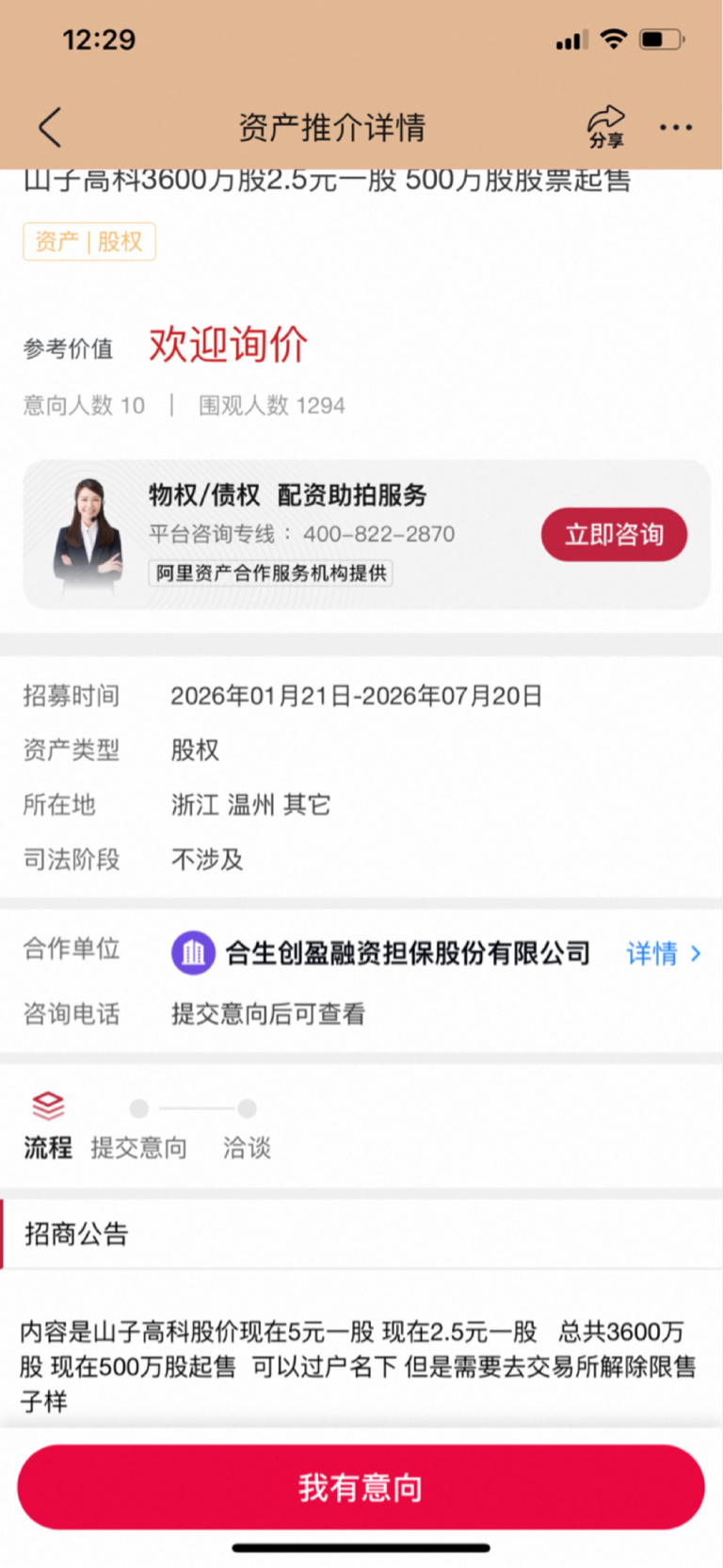 阿里拍卖意向人数已有10人
