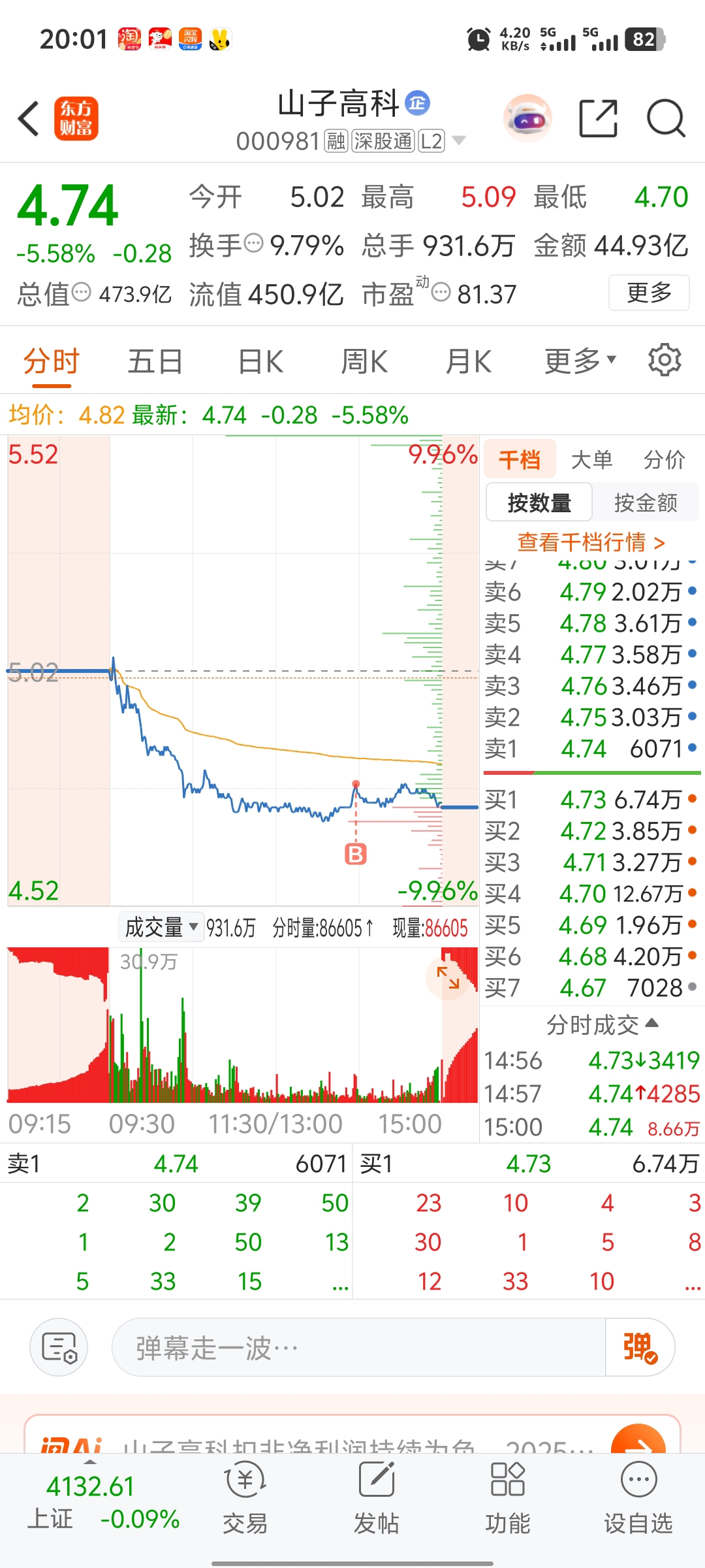 $山子高科(SZ000981)$ 我每次加仓都会跌,是立刻见效的那种,我不信明天会涨,我认命了,跌破二十日线,明天估计会是一碗超级大面条,比今天还要跌得惨,不信走着瞧!
