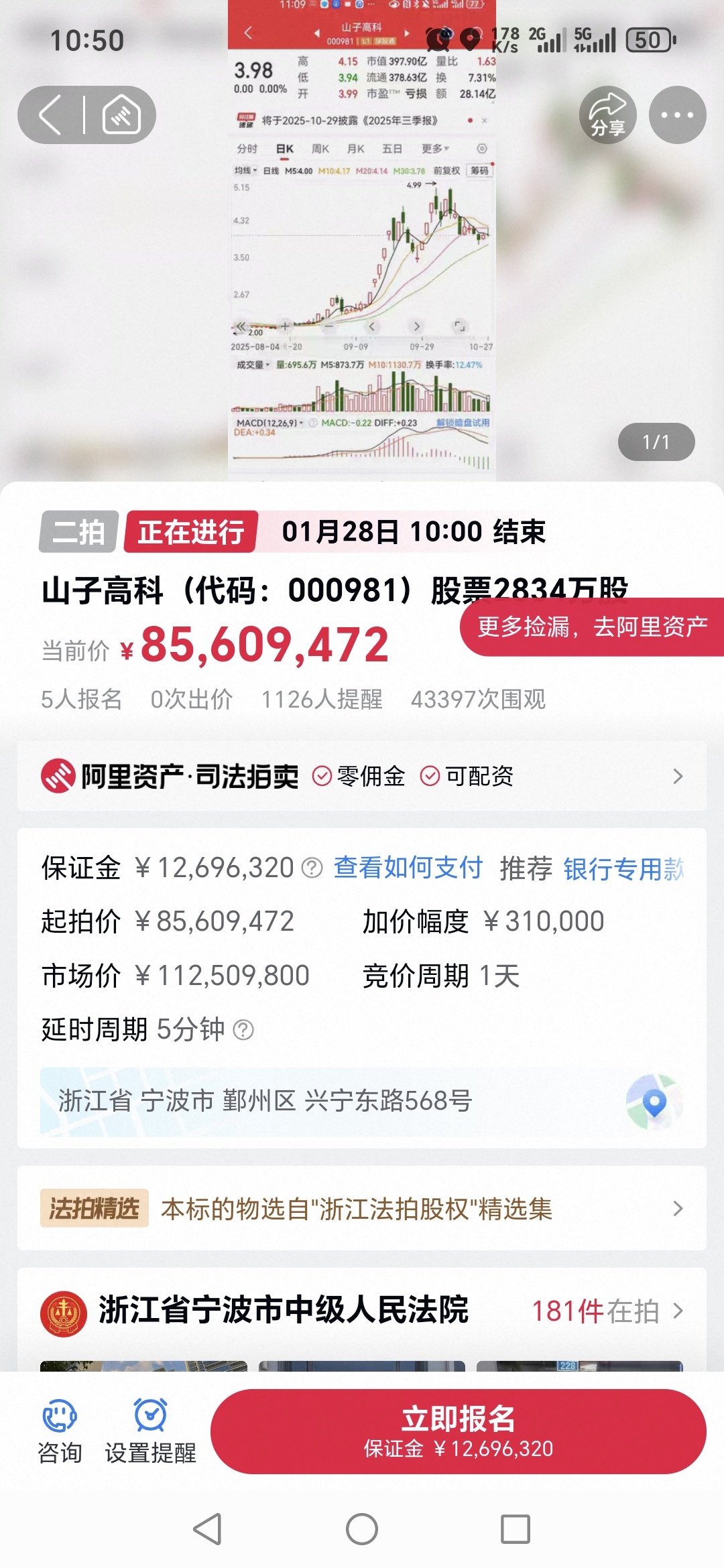 $山子高科(SZ000981)$ 我也报名了!大家都去凑个人数吧!现在有5人正在抢拍,高价者得板上定钉,可谓塞翁失马呀,之前太便宜无人问津,现在翻倍价都在争抢,太玩味了!!!