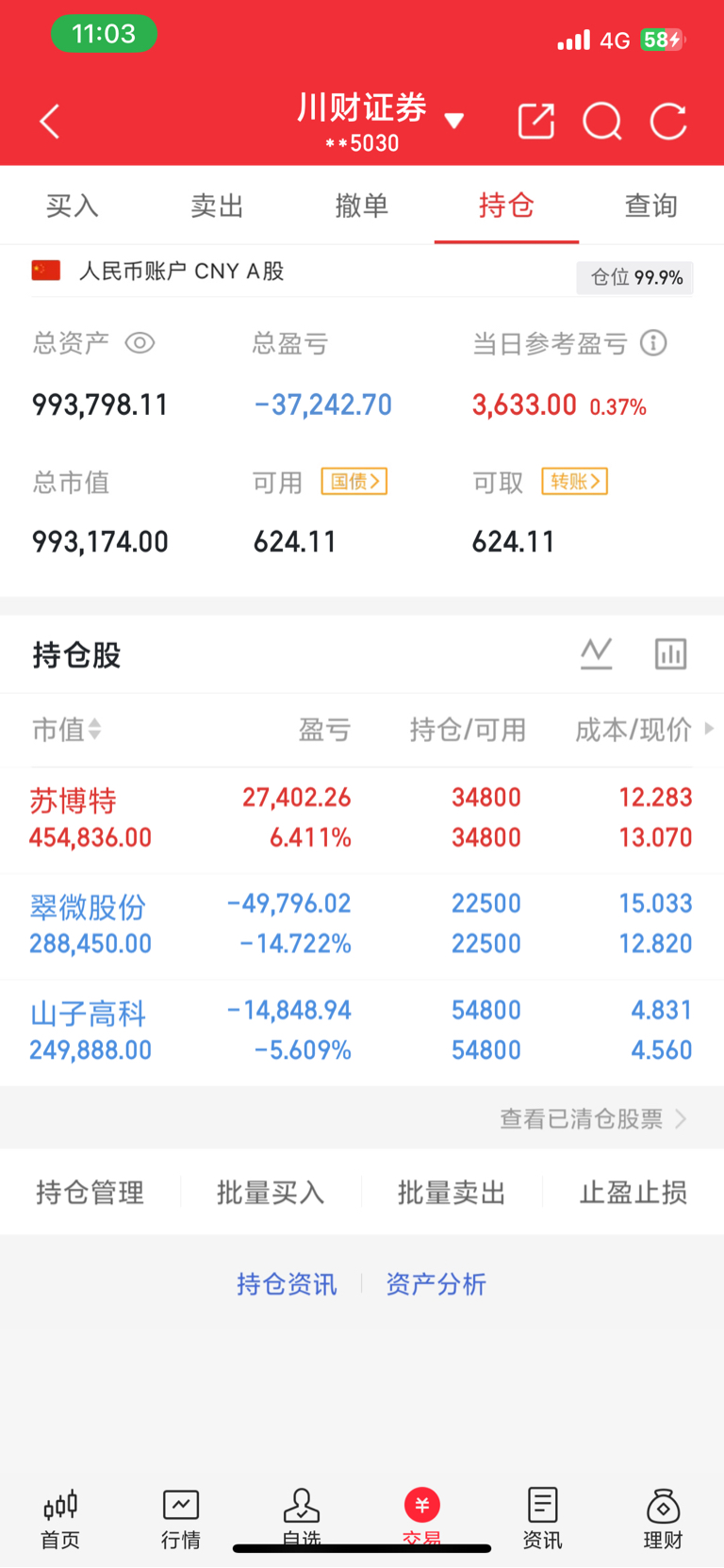 1.27继续持有 $山子高科(SZ000981)$ $翠微股份(SH603123)$ $苏博特(SH603916)$ 这三支具备增长潜力,我满怀期待,相信随着后续市场的发展,达成盈利目标。