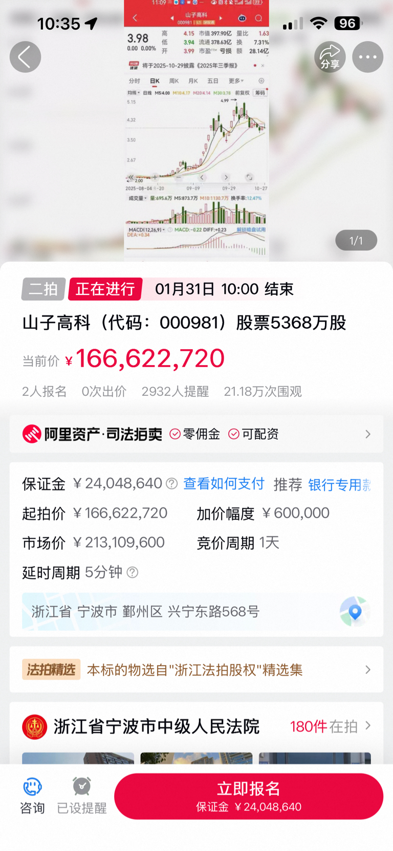 $山子高科(SZ000981)$ 不要急,不要慌,2个人报名了,大概率明天上午才是正式竞拍,今天要不是大盘拖累,山子也起飞了