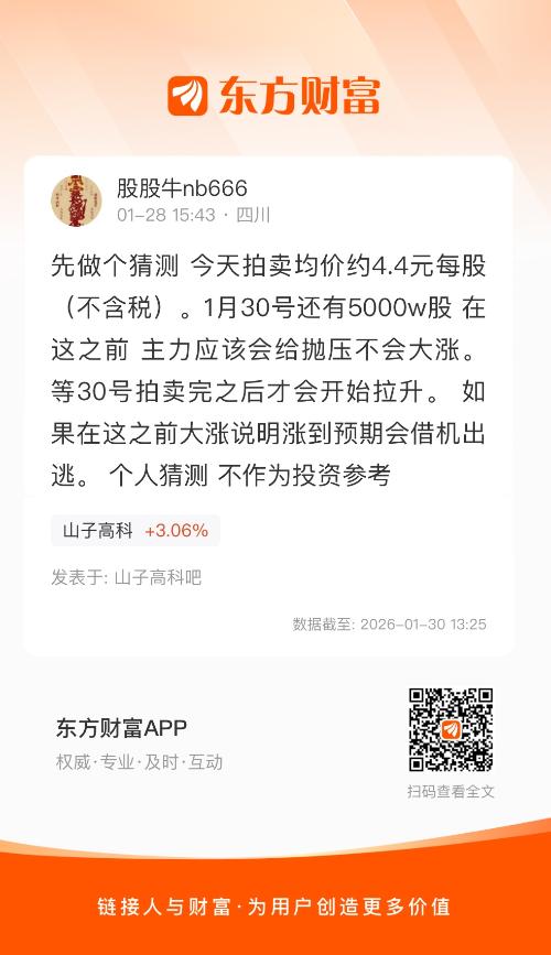 先做个猜测 今天拍卖均价约4.4元每股(不含税)。1月30号还有5000w股 在这之前 主力应该会给抛压不会大涨。 等30号拍卖完之后才会开始拉升。 如果在这之前大涨说明涨到预期会借机出逃。 个人猜测 不作为投资参考