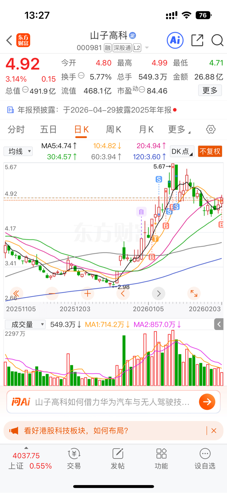 $山子高科(SZ000981)$ 卖了中超来你这里了,织布吧没关系 起码稳 不敢乱动了