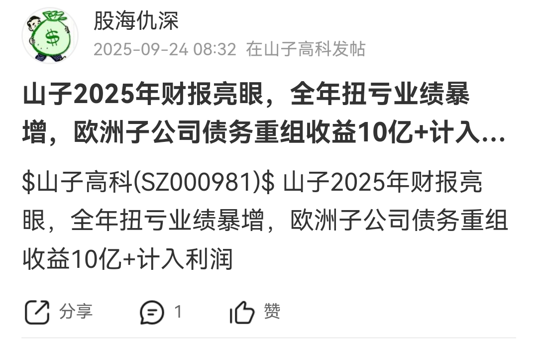 $山子高科(SZ000981)$ 山子年报业绩暴增的事情在9月就跟你们说过了