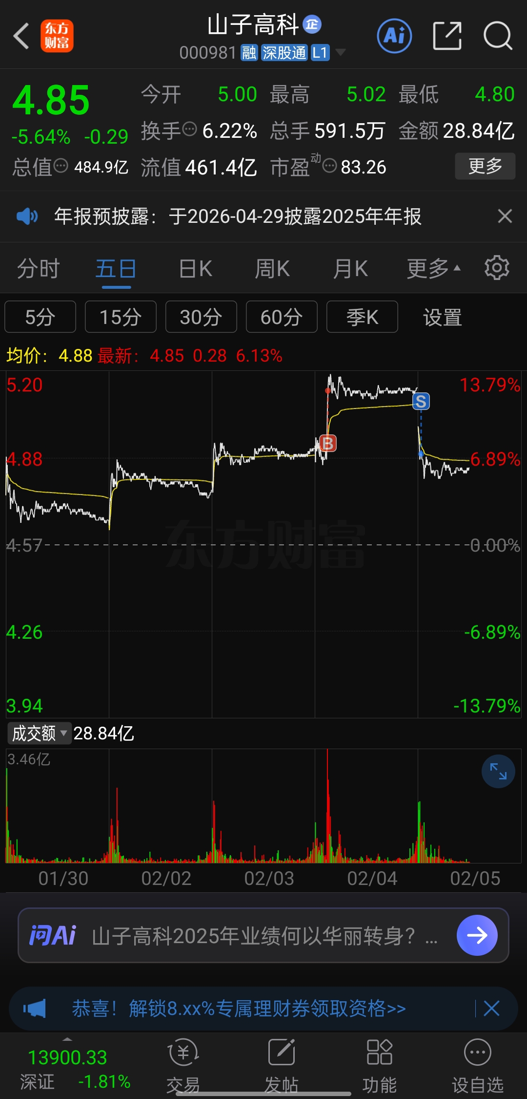 $山子高科(SZ000981)$ 亏2万多,平仓出局了。感觉恒生指数和大盘都下跌的趋势。